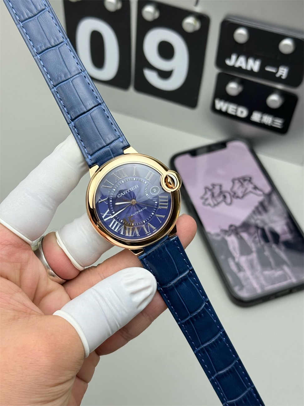The Cartier Ballon Bleu 42mm Rose Gold replica breaks the mold of traditional white-dial watches. The contrast between the warm Rose Gold case and the cool Midnight Blue dial creates a visual masterpiece. AF Factory has perfected the gold tone, ensuring it matches the genuine “Pink Gold” hue without looking like cheap copper.