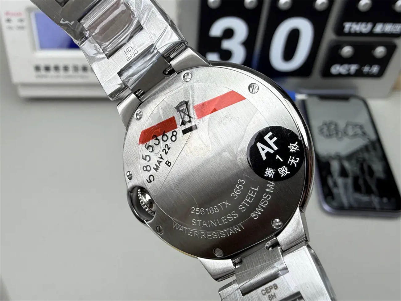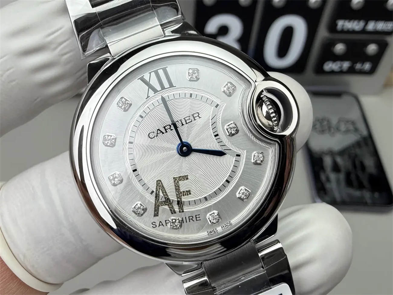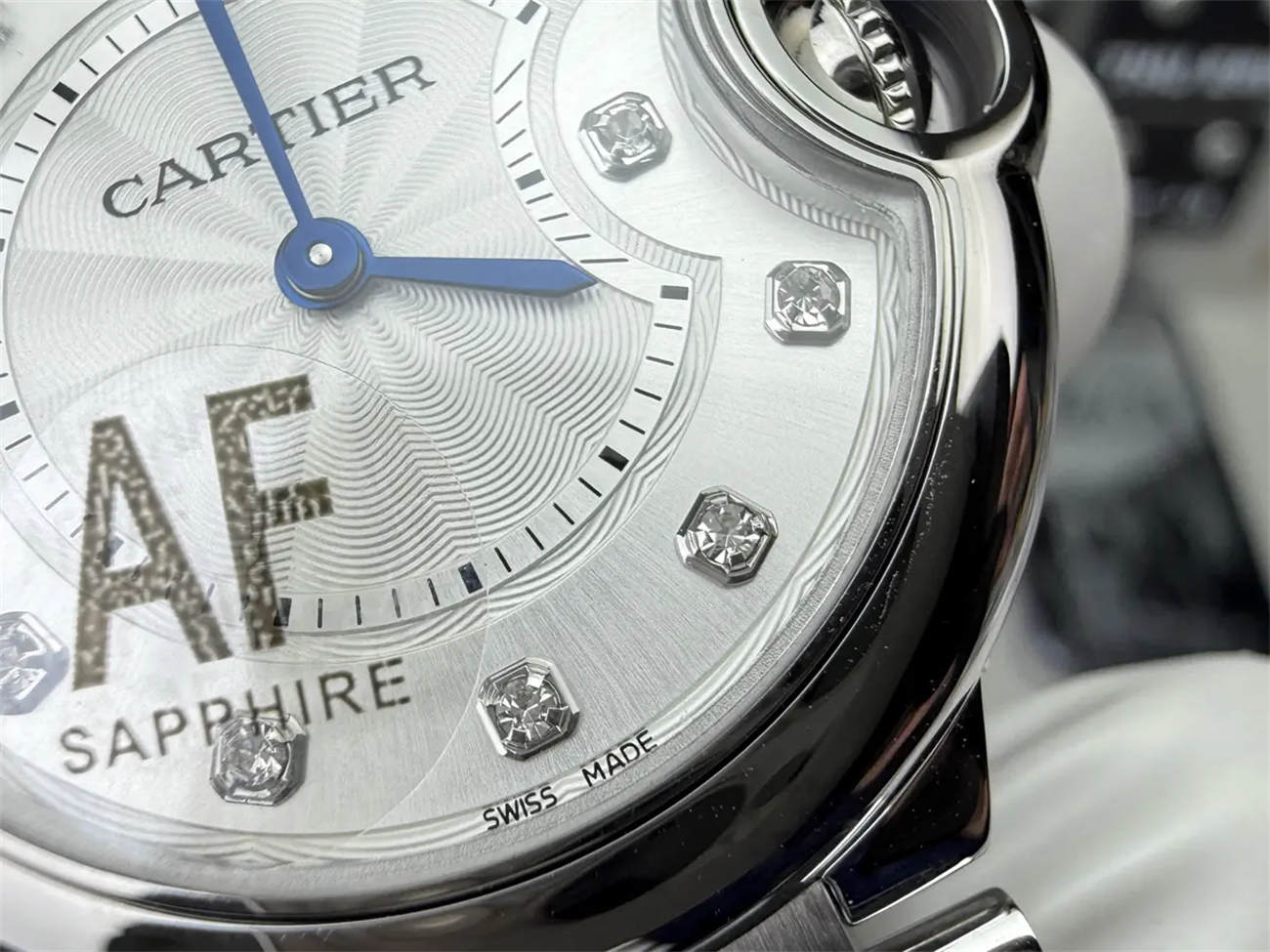 Most cheap replicas have flat glass. AF Factory uses a high-grade domed sapphire crystal that creates the signature optical distortion (Fish-Eye effect) on the Roman numerals, just like the genuine Cartier Ballon Bleu replica.