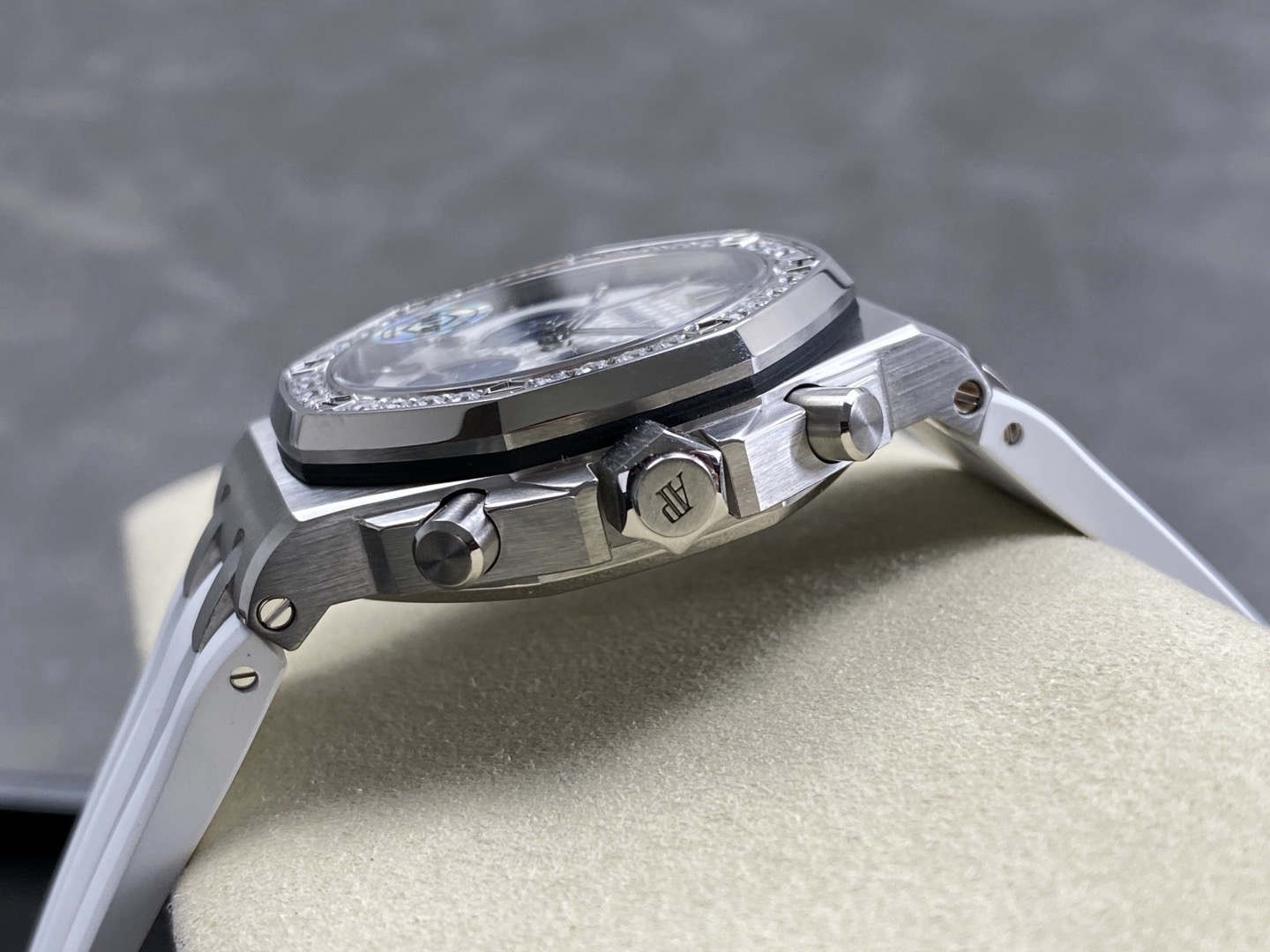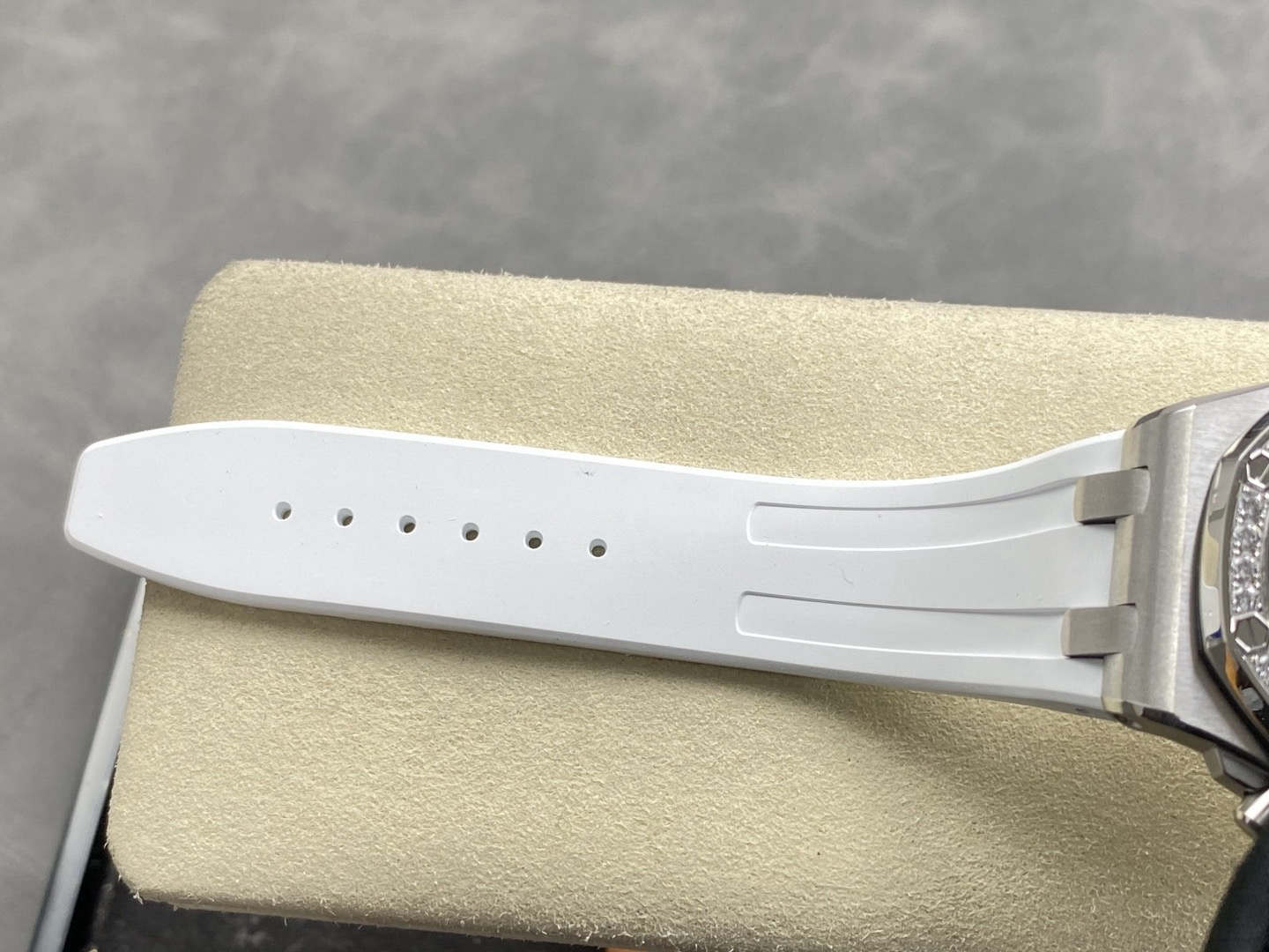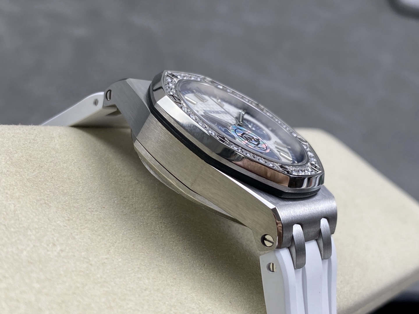 A luxury watch should wear elegantly, not like a stiff bangle. The APS 37mm Royal Oak has mastered wearability by introducing articulating (movable) end-links. Unlike lower-tier models where the metal links connecting to the rubber strap are rigidly fixed, the APS end-links pivot naturally. This allows the premium elastomer rubber strap to drop straight down, contouring perfectly to women’s wrists or men with wrists under 6.5 inches. Combined with the true-to-spec 12.4mm case thickness, the wrist presence is incredibly authentic.