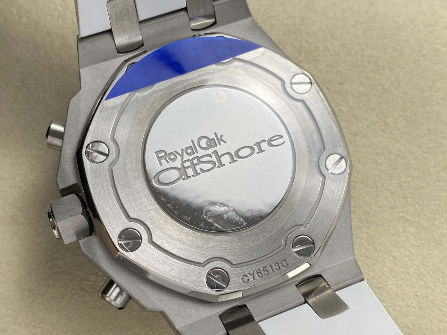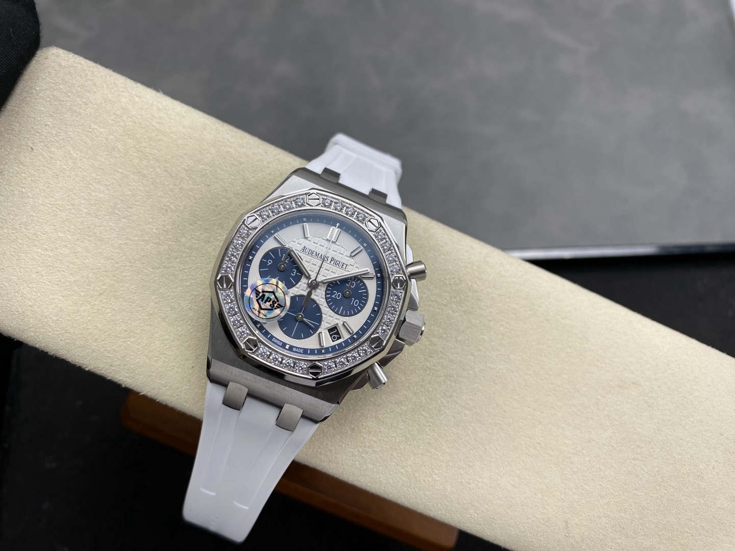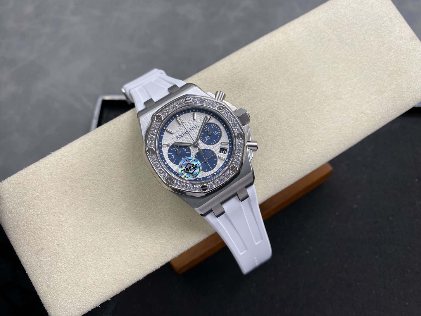 A luxury watch should wear elegantly, not like a stiff bangle. The APS 37mm Royal Oak has mastered wearability by introducing articulating (movable) end-links. Unlike lower-tier models where the metal links connecting to the rubber strap are rigidly fixed, the APS end-links pivot naturally. This allows the premium elastomer rubber strap to drop straight down, contouring perfectly to women’s wrists or men with wrists under 6.5 inches. Combined with the true-to-spec 12.4mm case thickness, the wrist presence is incredibly authentic.