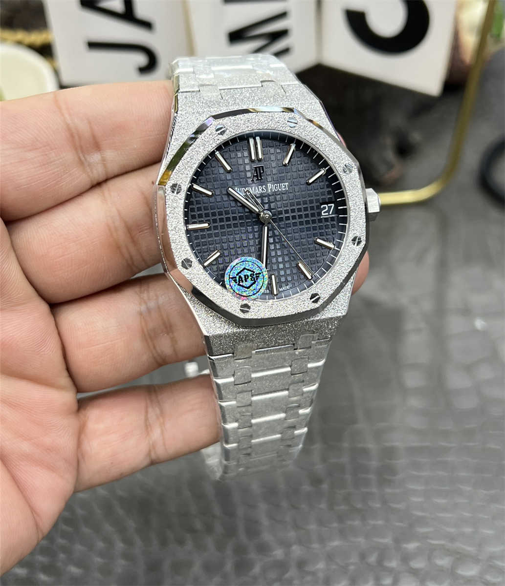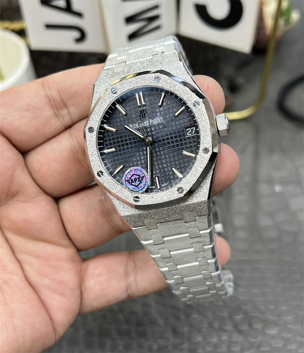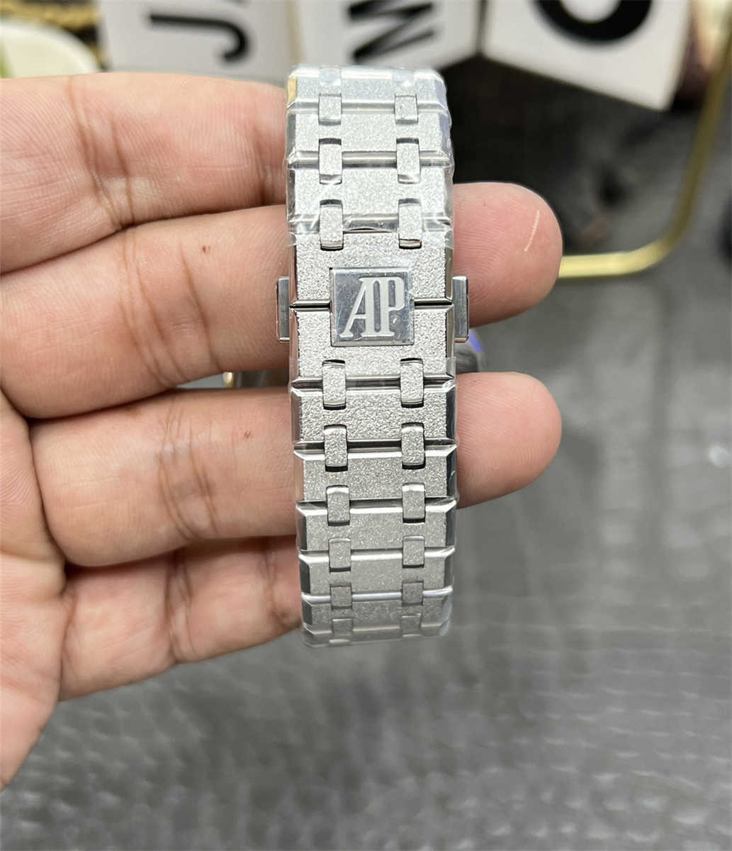The shimmering frost finish adds a luxurious boutique-mod look that stands out from standard steel Royal Oak replicas.