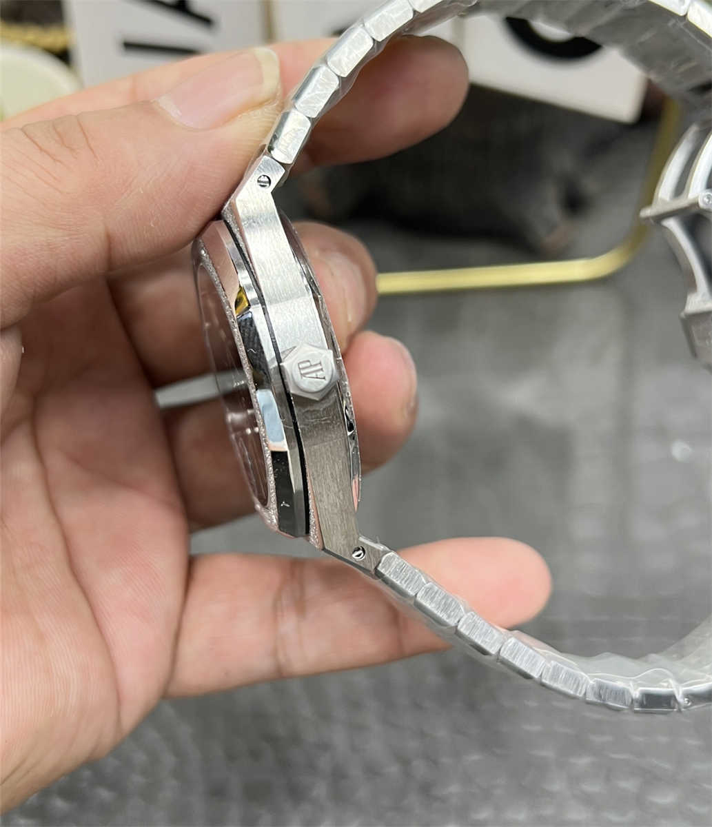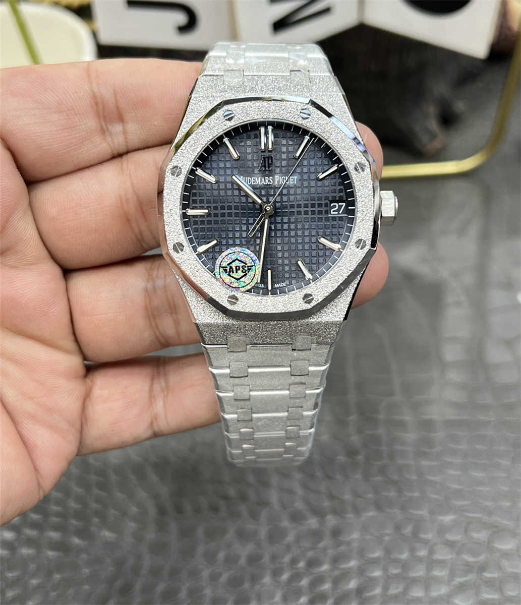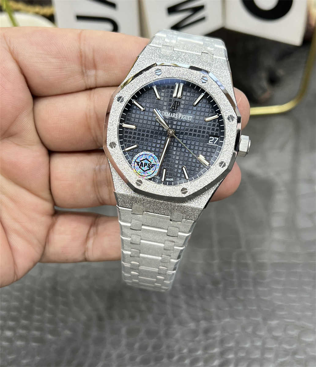 The shimmering frost finish adds a luxurious boutique-mod look that stands out from standard steel Royal Oak replicas.