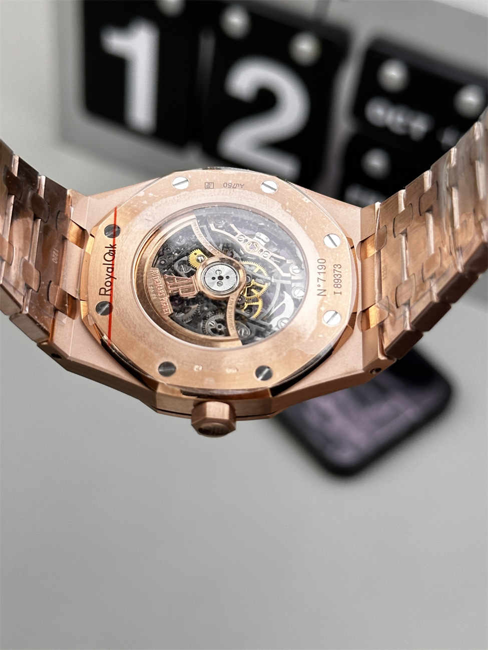 The warm rose gold tone enhances the sharp geometry of the Royal Oak design, creating a powerful contrast against the openworked movement beneath.