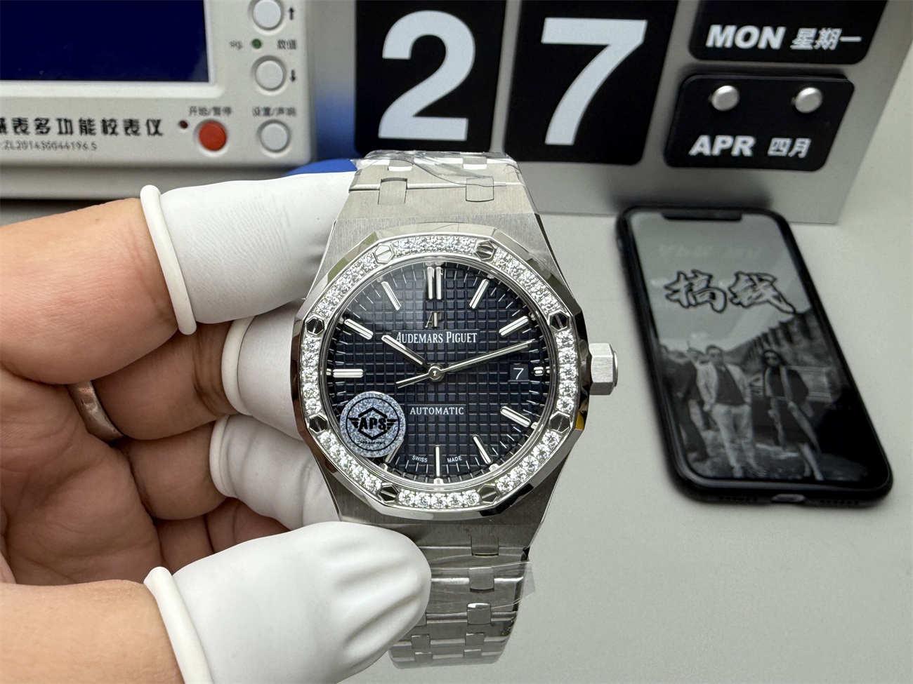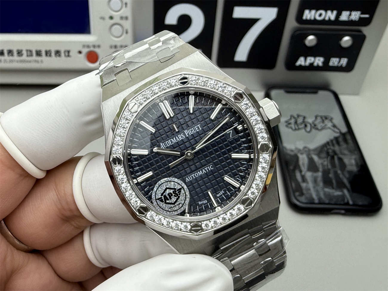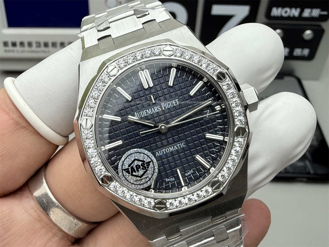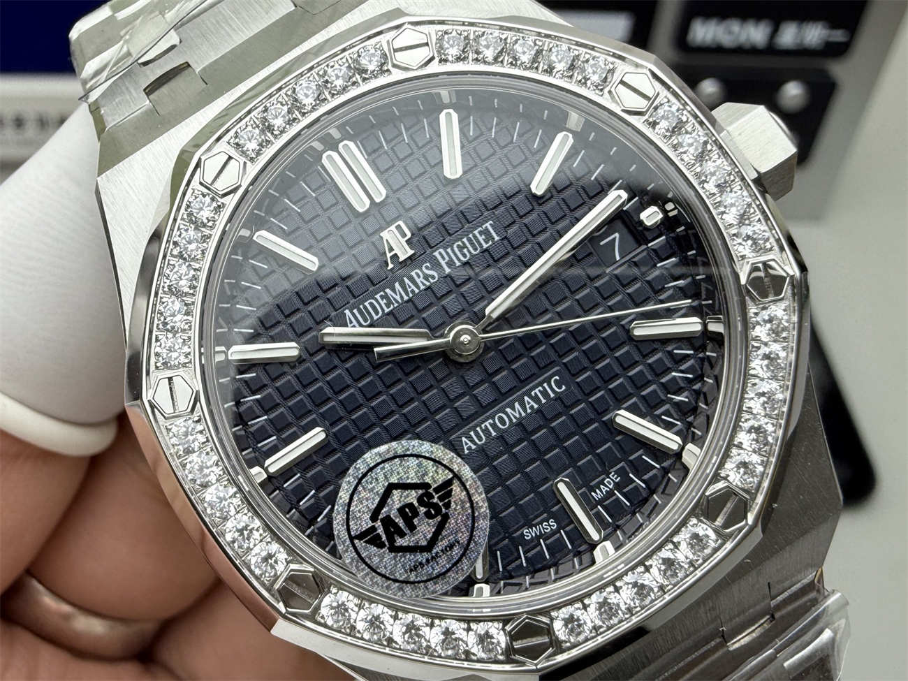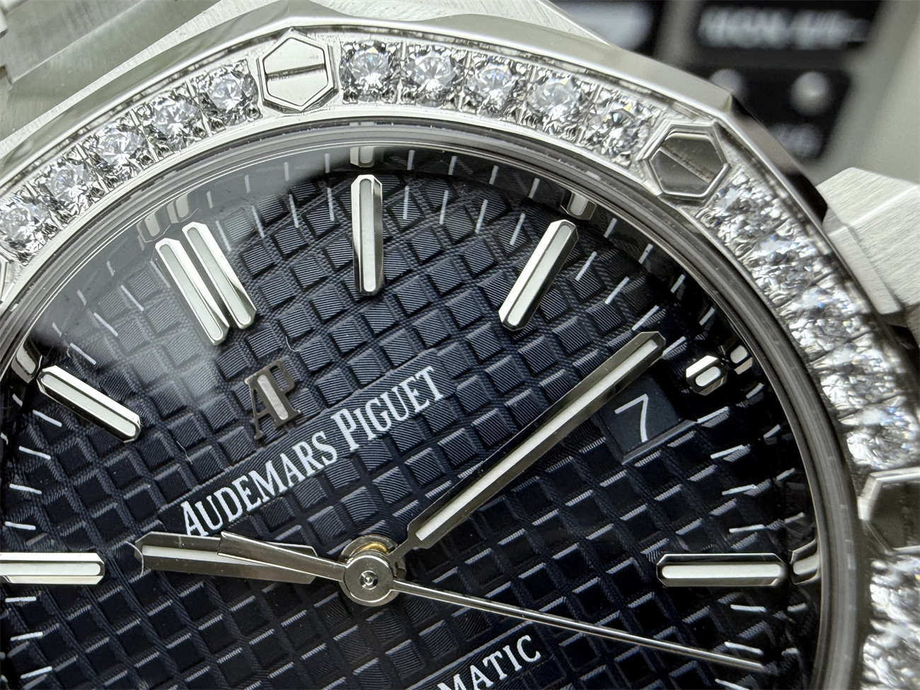 The diamond-set bezel enhances the visual appeal, adding undeniable luxury while maintaining the sporty character of the Royal Oak. Each stone is set with consistent alignment, ensuring a seamless and high-end look.