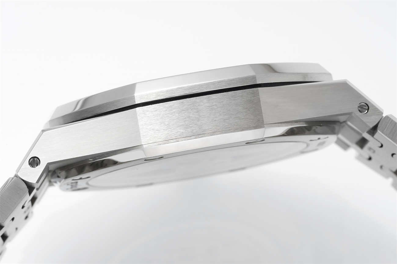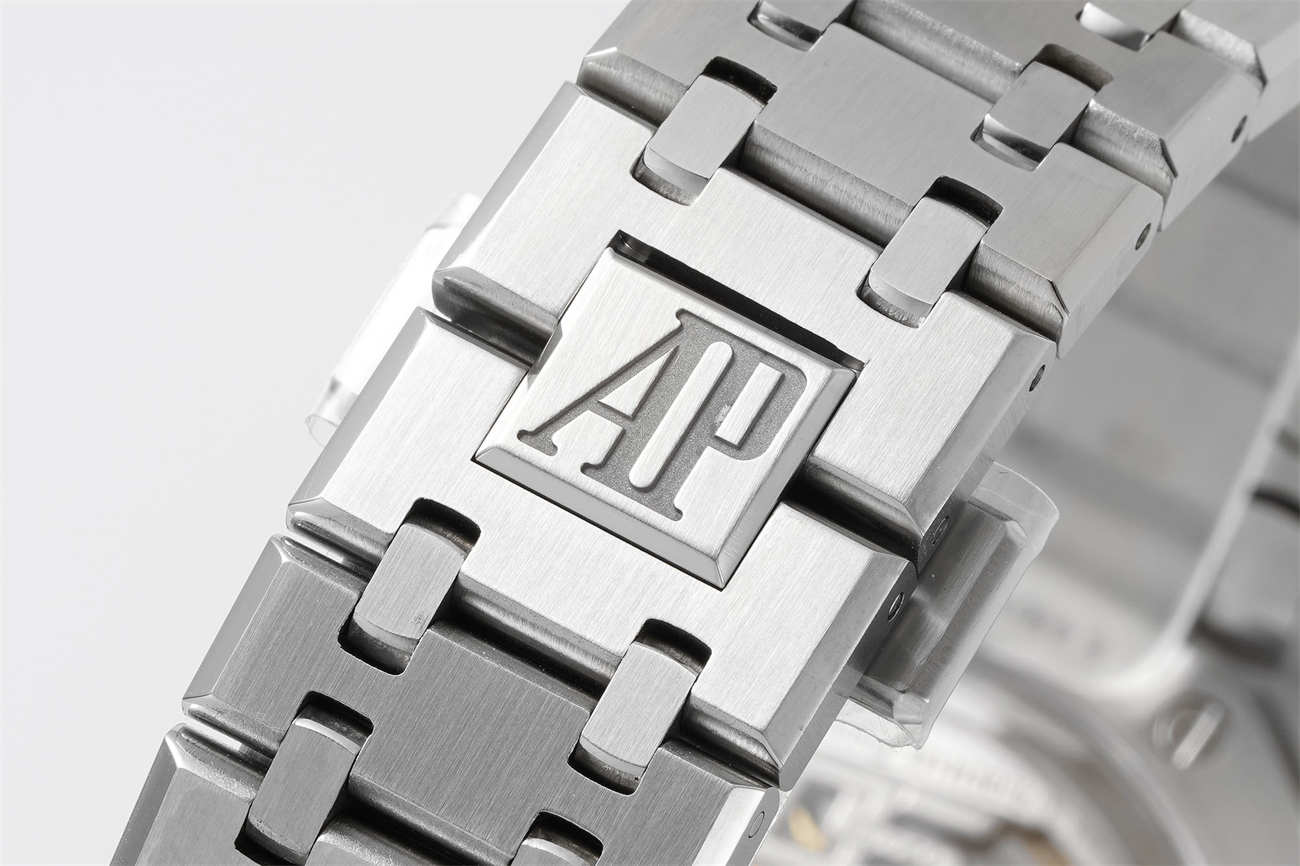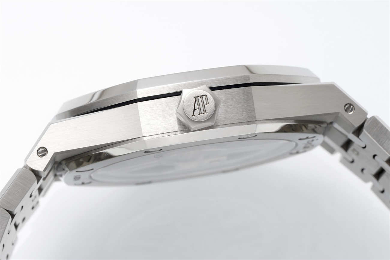 The watch features a robust 41 mm stainless steel case: brushed surfaces enhanced by polished bevels present a refined yet solid look. The integrated bracelet and streamlined geometry echo the iconic Royal Oak design.