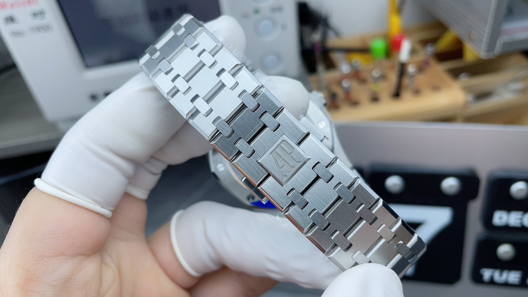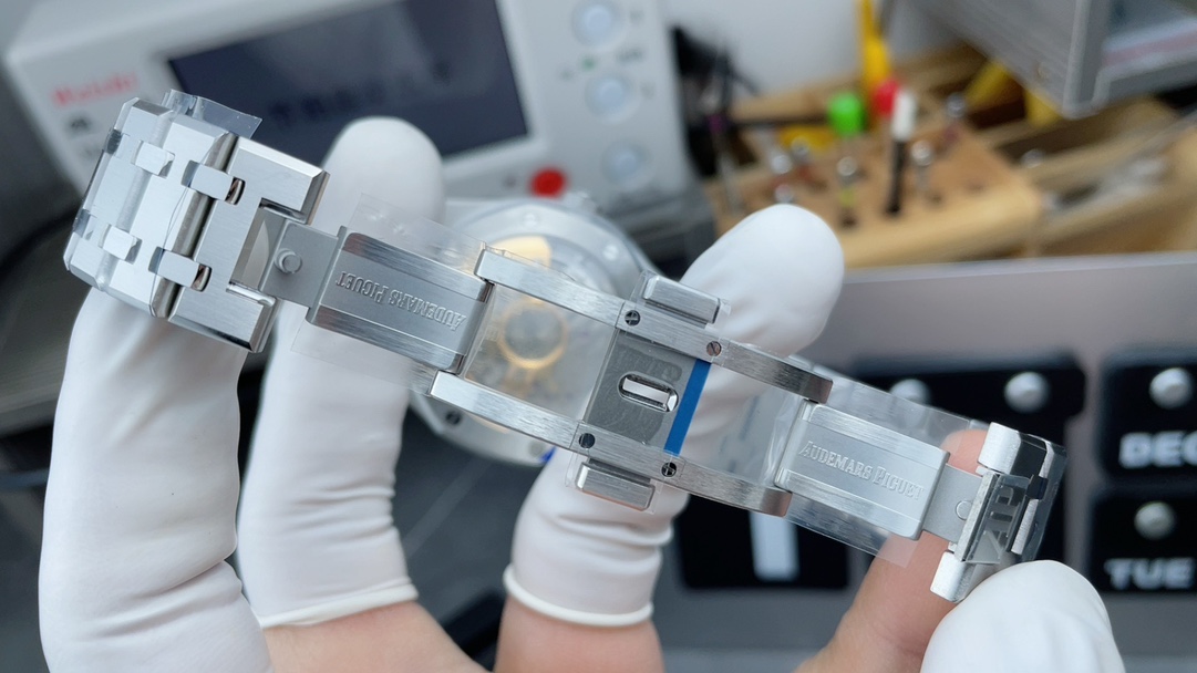 The integrated bracelet flows seamlessly from the case, giving the watch a cohesive, sculpted silhouette. Each link is meticulously finished: brushed surfaces with polished bevels, delivering an overall luxury feel that’s unmistakably Royal Oak. The bracelet’s comfort and ergonomic design make the 15510 Blue suitable for daily wear and extended use.