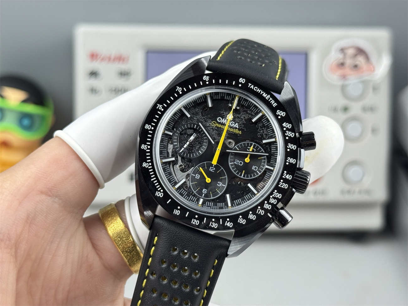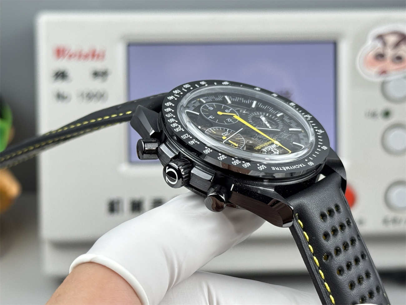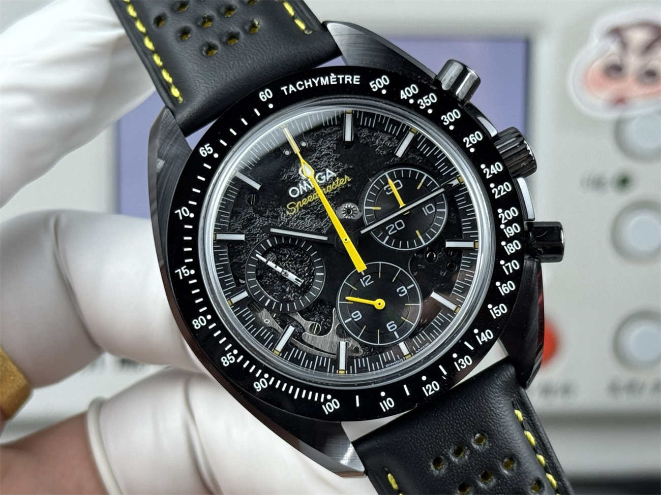 Unlike cheap PVD replicas that scratch and show steel underneath, this Omega Speedmaster Apollo 8 replica is made of solid black ceramic. It feels cool on the skin, is hypoallergenic, and will never fade. The bezel numbers are filled with bright white enamel for long-lasting legibility.