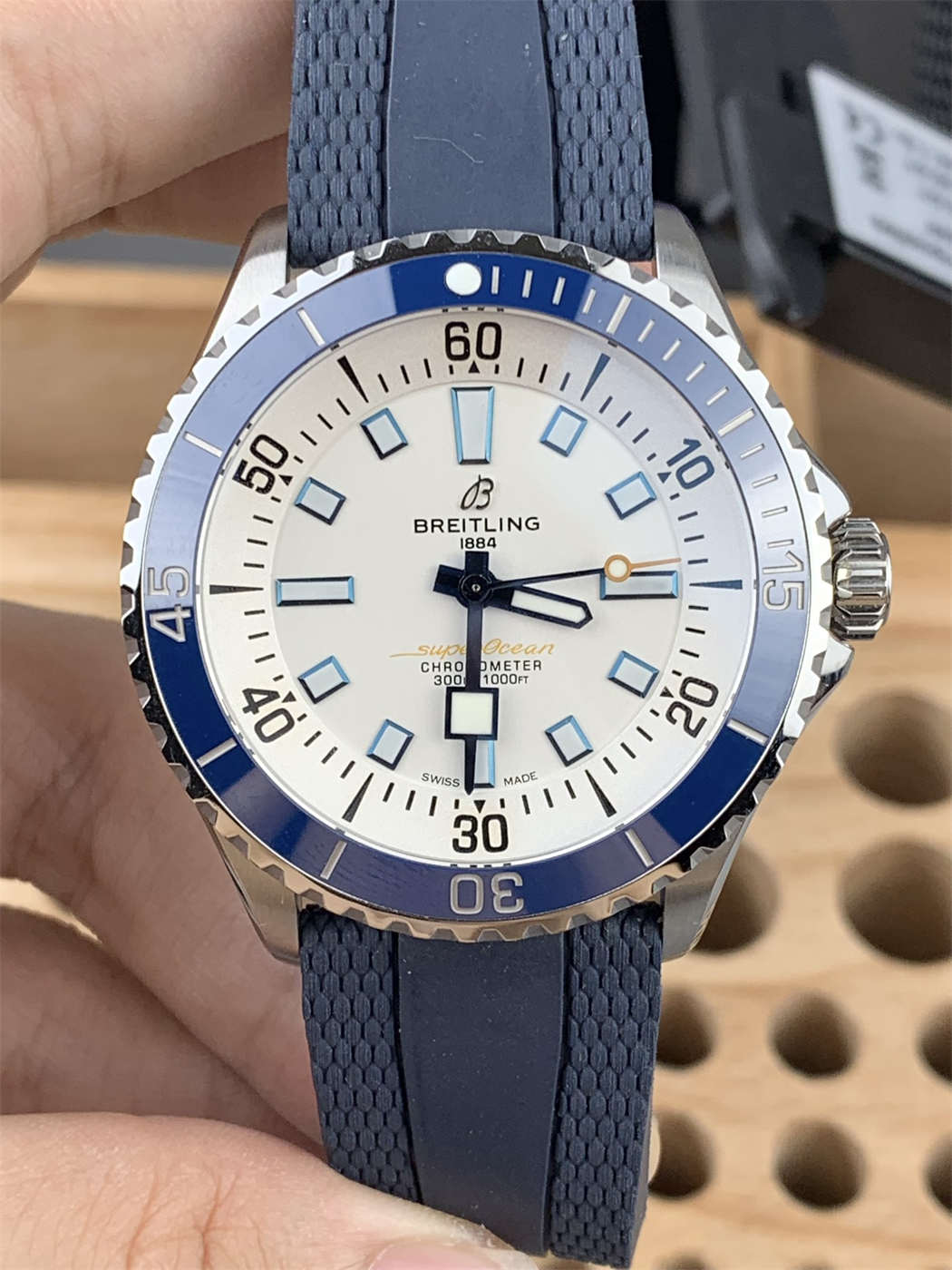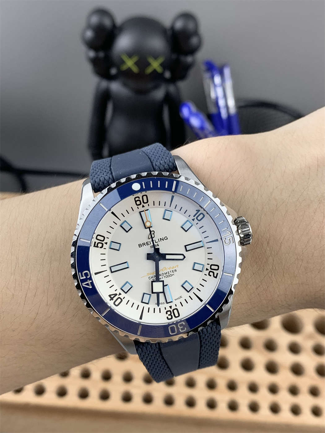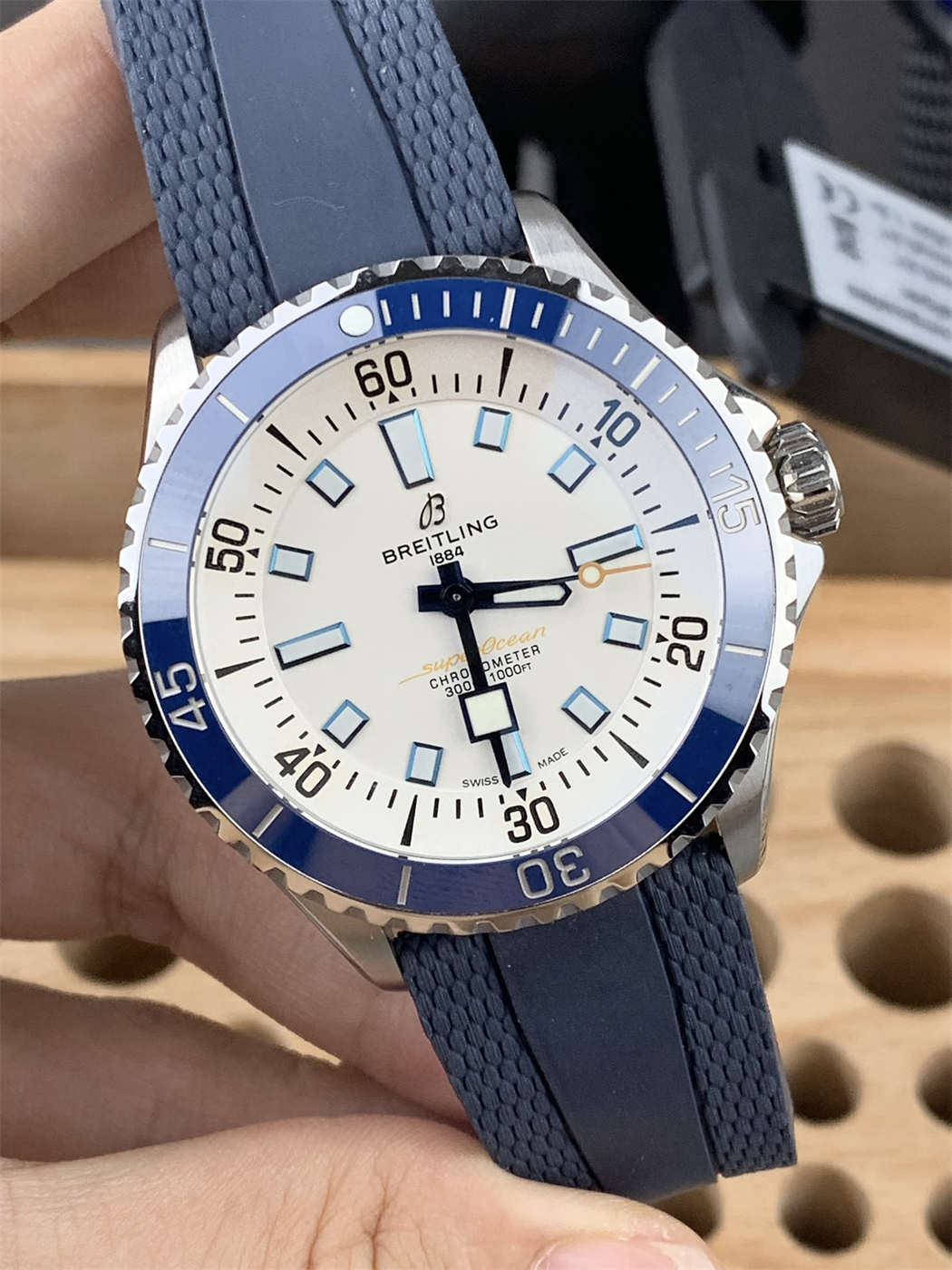 The breitling superocean blue bezel replica is instantly recognizable thanks to its striking blue-and-white color combination. The deep blue ceramic bezel paired with a clean white dial creates a fresh, sporty look that stands out both underwater and on the wrist.