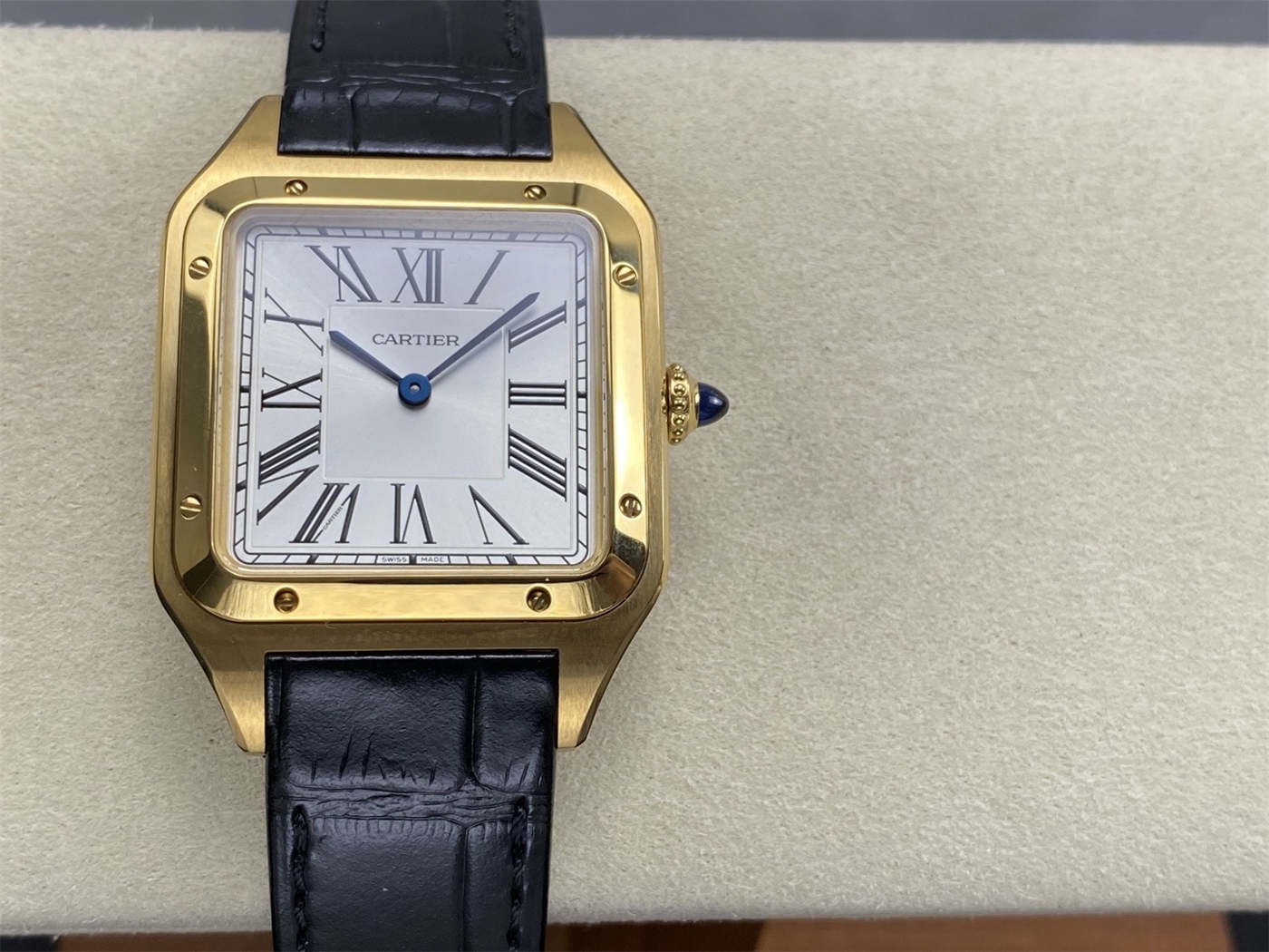 The Cartier Santos Dumont XL in Gold is timeless. It pairs the warmth of 18k Yellow Gold with a crisp white dial, creating a look that never goes out of style.