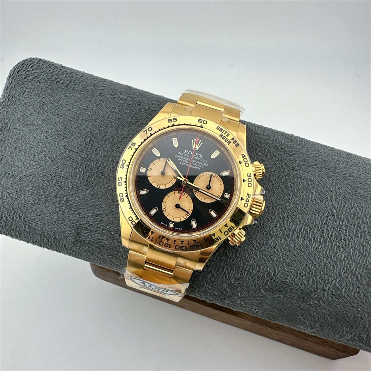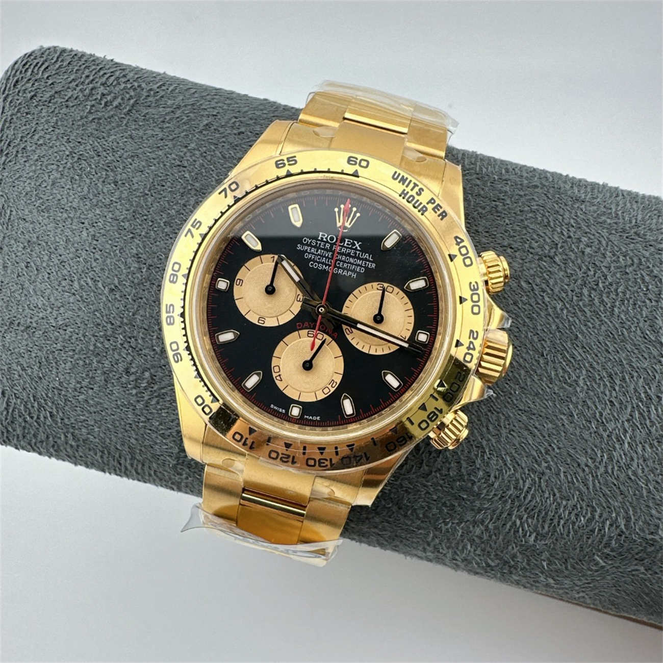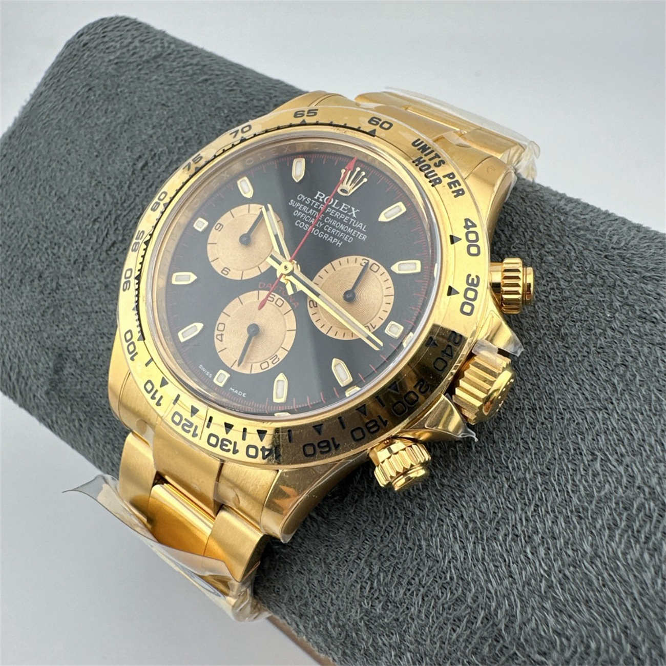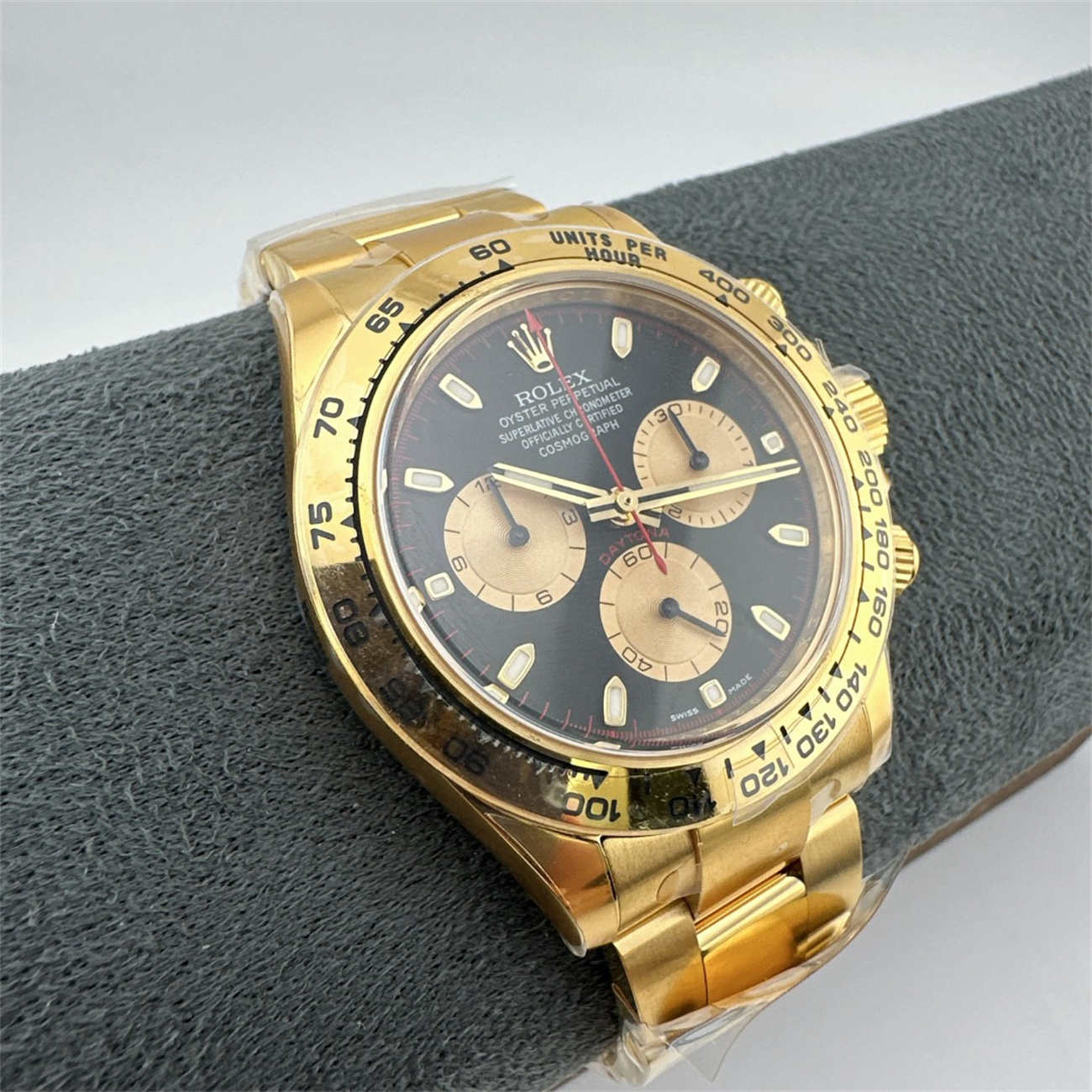 A: This Rolex Daytona 116508 replica weighs approx. 145g. Note that the genuine 18K gold watch weighs over 200g because gold is denser than steel. While lighter, the replica still feels solid and substantial on the wrist.