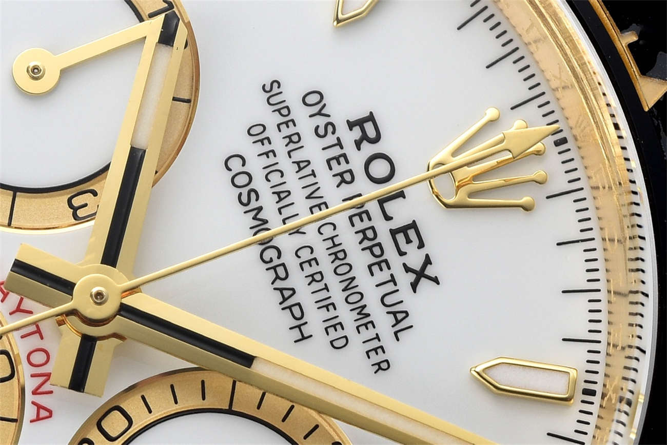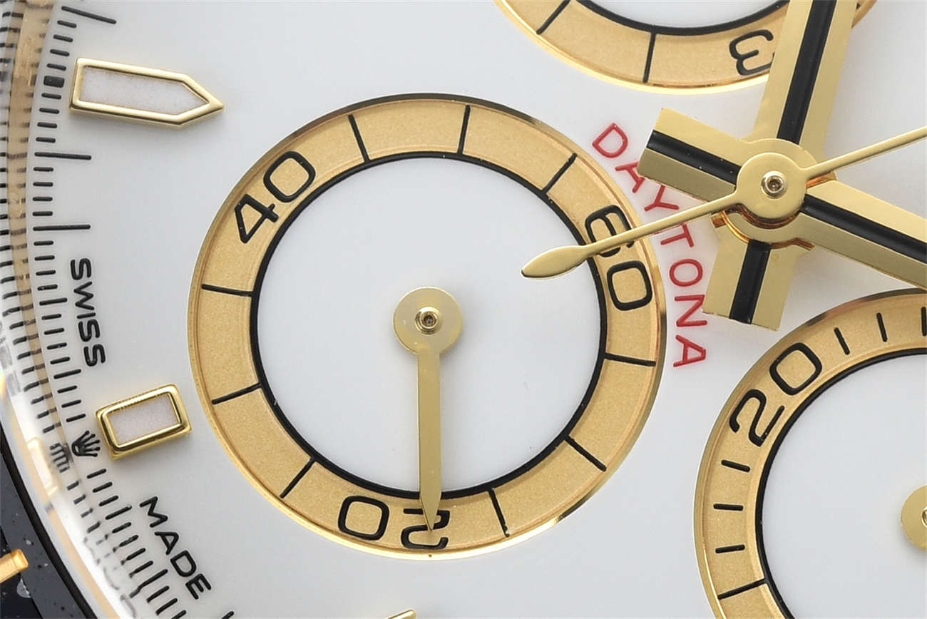This Rolex Daytona 126518LN replica features the updated case shape. The lugs are sharper and more tapered. The ceramic bezel is no longer exposed at the edge; it is encased in a polished gold ring, protecting it from chips and adding a layer of refinement.
