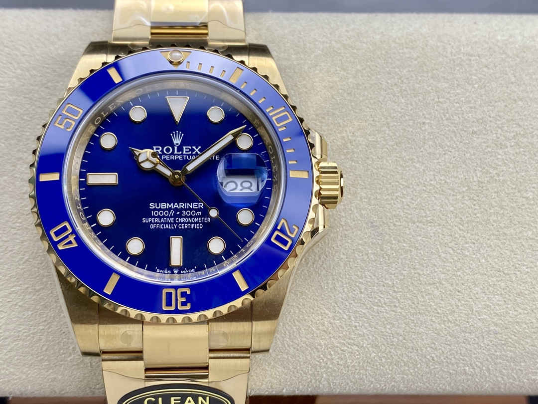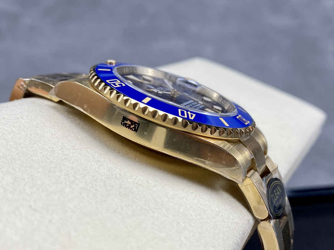 The combination of gold, blue, and ceramic gives the Clean Factory Rolex Submariner 126618LB its signature, luxurious aesthetic.