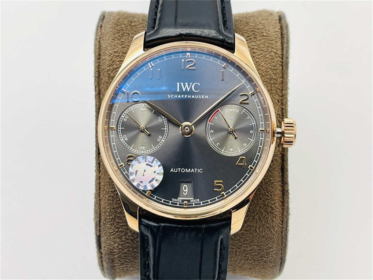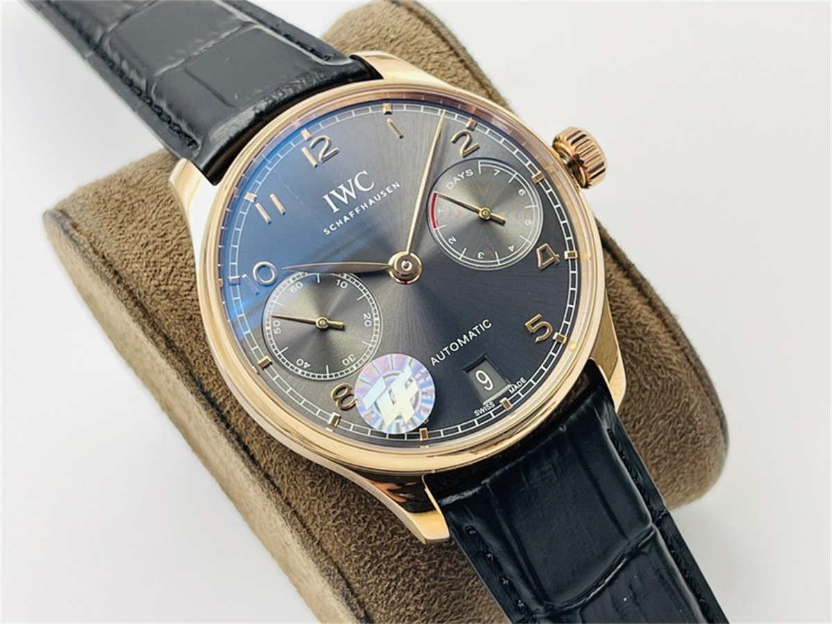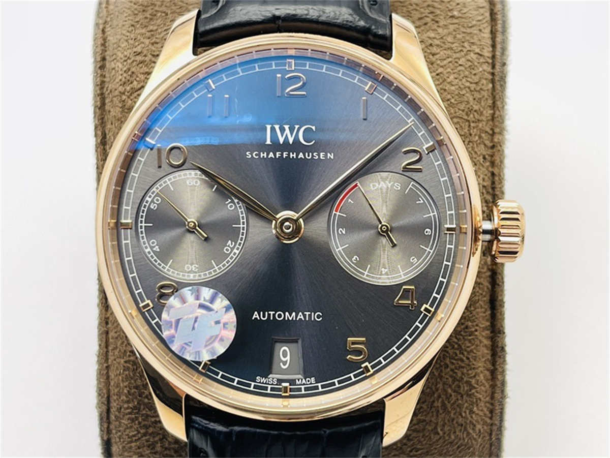 The IW500702 is famous for its rose-gold case and grey sunburst dial—a combination that has become a trademark of refined IWC craftsmanship.The replica faithfully preserves these elements: