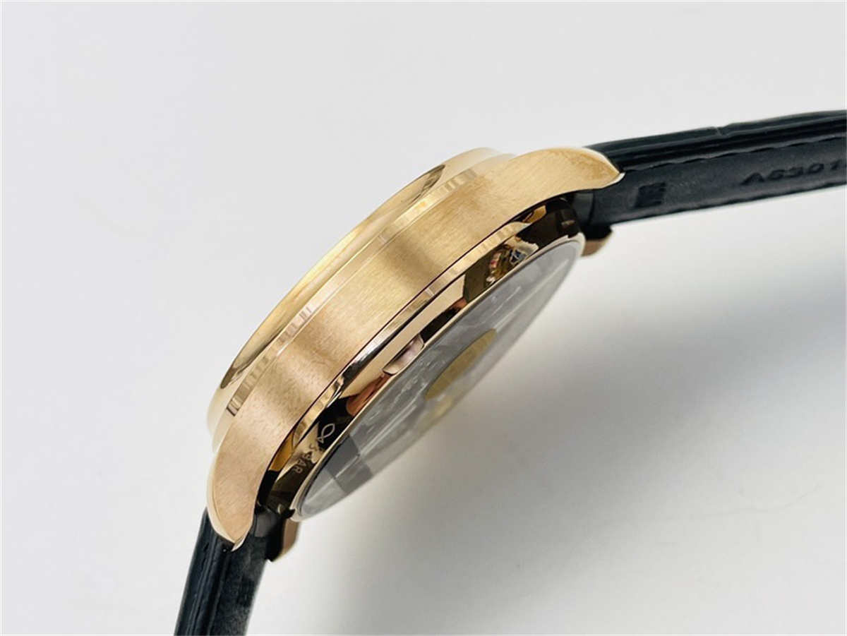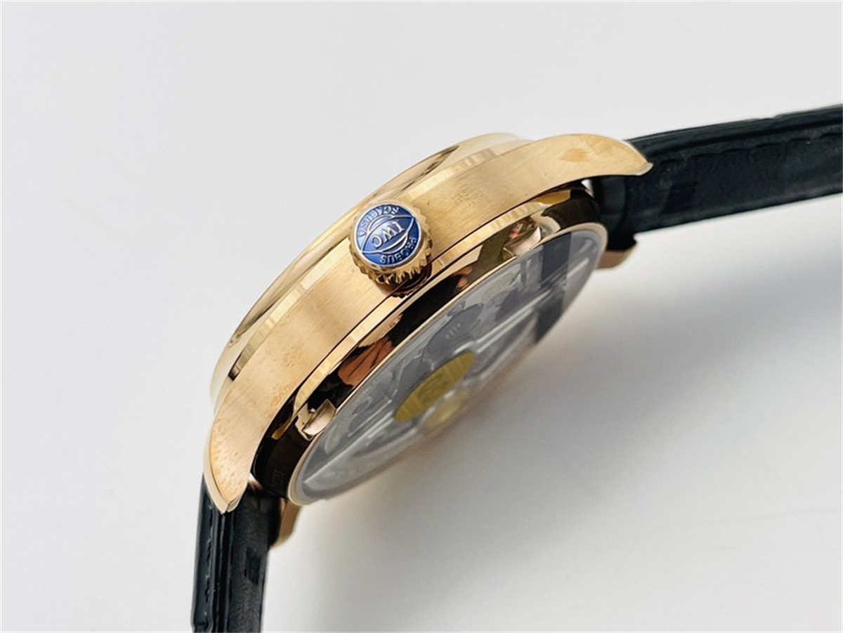 The IWC IW500702 replica uses a polished stainless-steel case coated with rose-gold plating for rich color and durability. While not real 18K gold, it offers an impressive appearance and strong wear resistance.