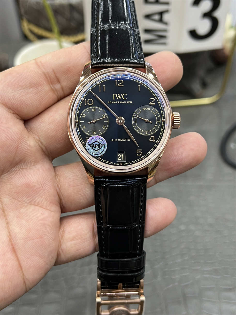 The APS Factory IWC IW501707 is a high-level recreation of the iconic Portuguese 7-Day model, combining the brand’s classical aesthetics with the factory’s precise craftsmanship. This 42mm rose-gold version with a black dial stands out for its elegant proportions, crisp finishing, and strong visual resemblance to the genuine Portugieser series.