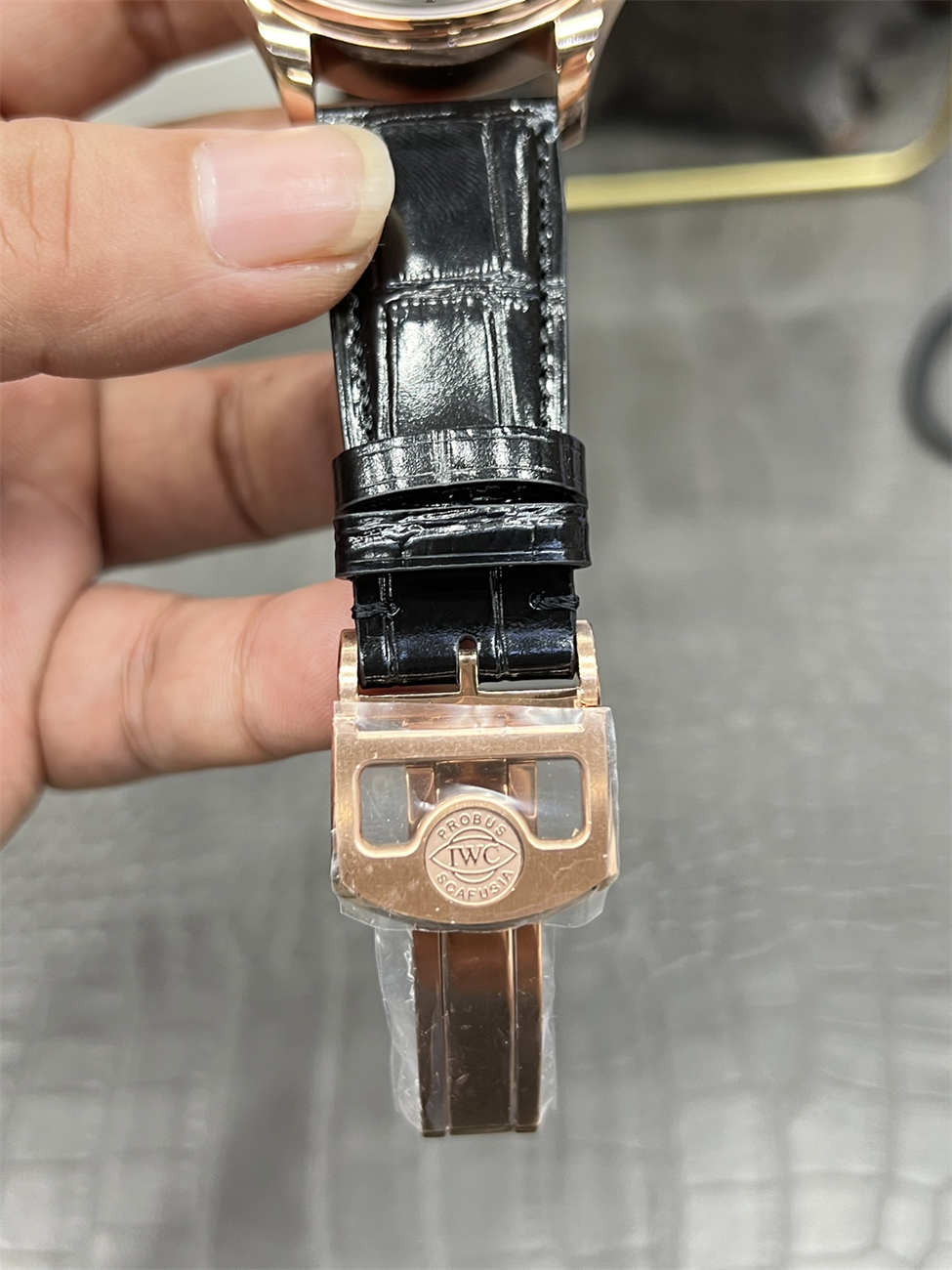 The IWC IW501707 comes with a black alligator-pattern leather strap, offering comfort and elegance. Strap quality is soft, durable, and designed to complement the rose-gold case.