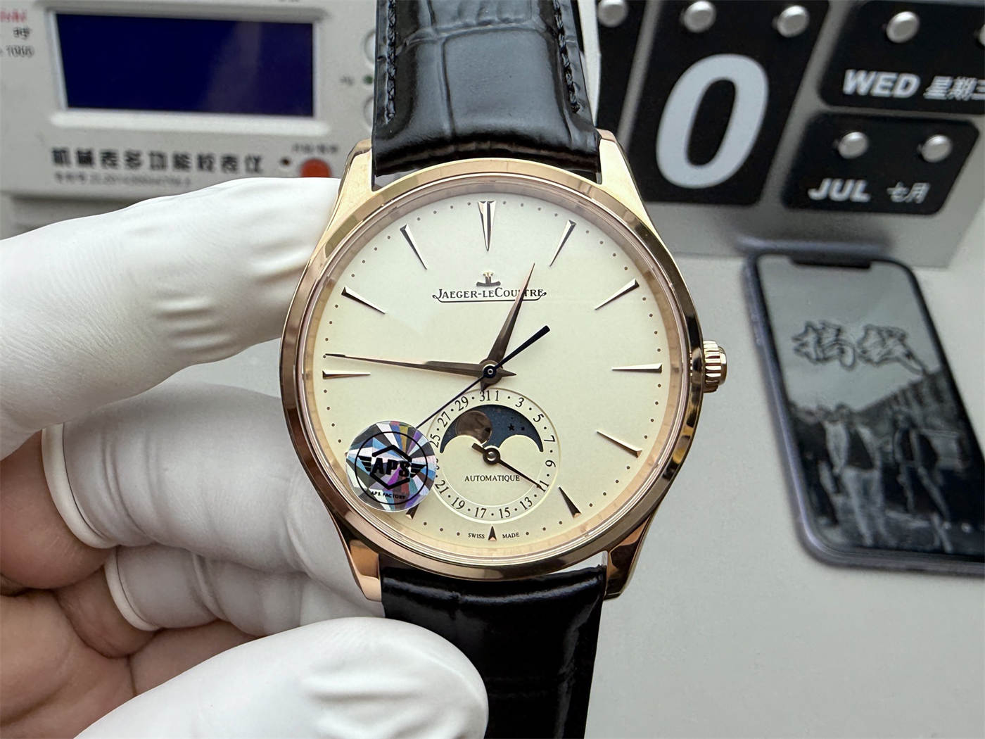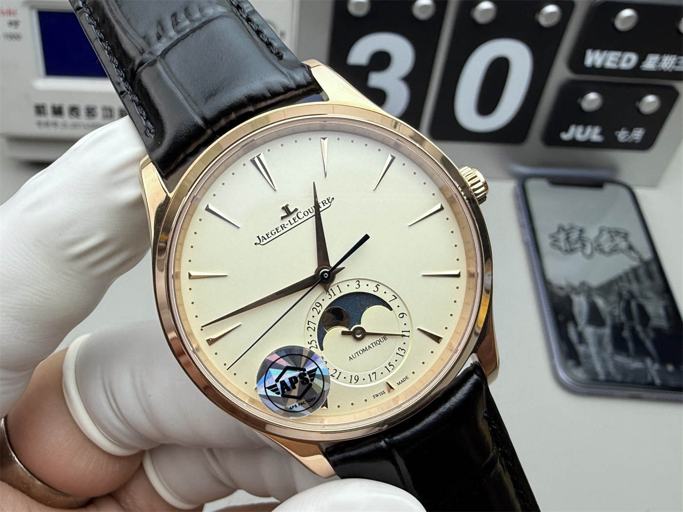 The jlc master moon phase 1362510 replica by APS Factory features a 39mm 18K rose gold-plated case, elegant silver dial with moon phase display and date, and a refined automatic mechanical movement. A classic dress watch with timeless style and functional refinement.