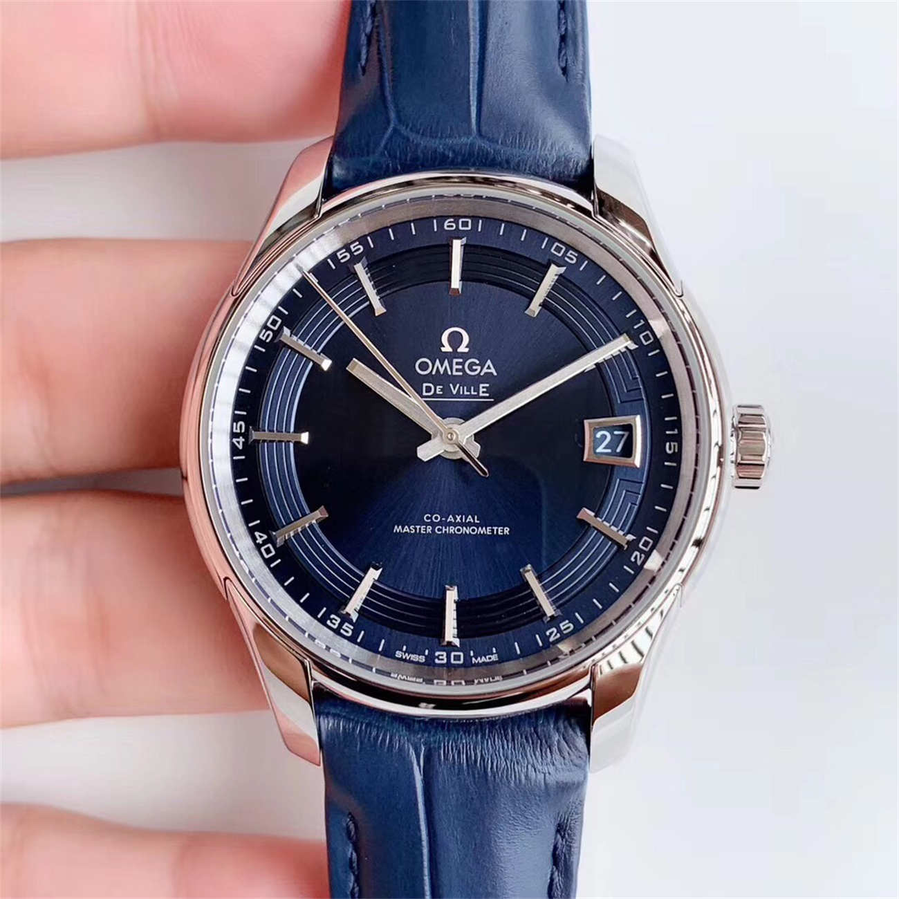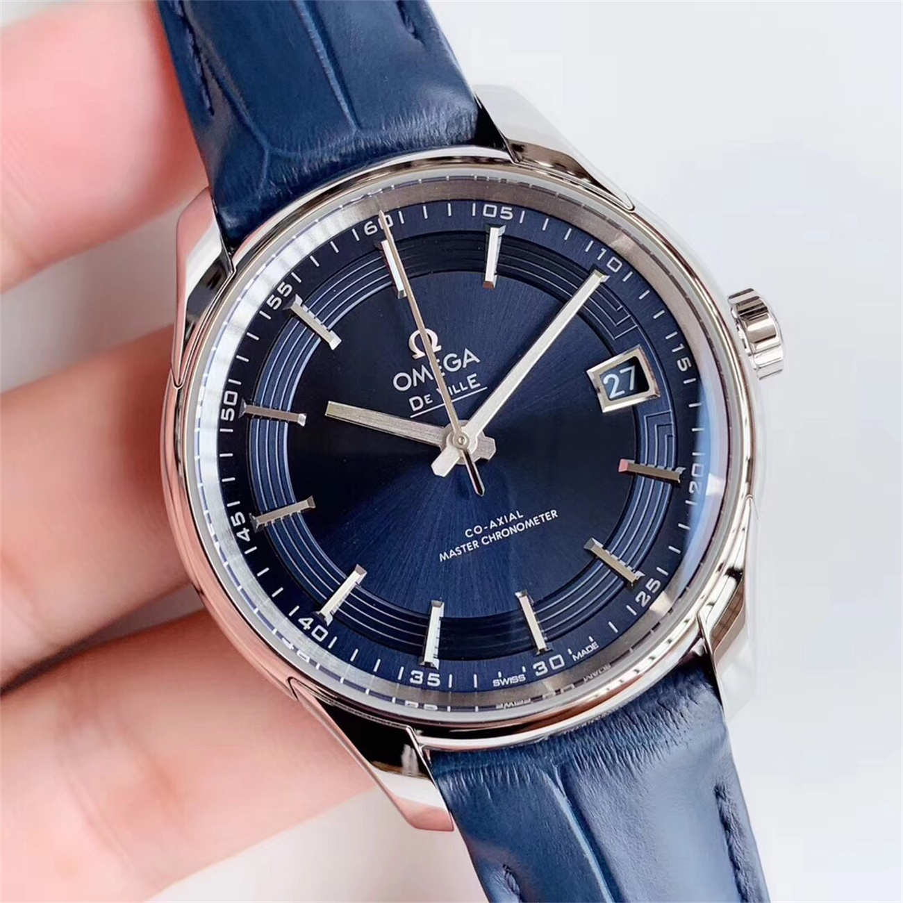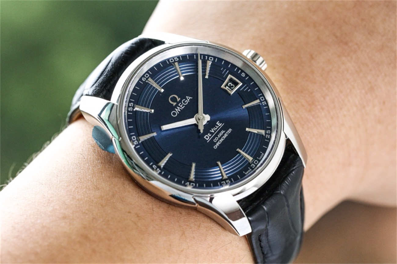 At 41mm, this Omega De Ville Hour Vision Blue replica is the perfect size for a modern dress watch. It pairs perfectly with a suit but has enough character (thanks to the blue dial) to be worn with smart-casual attire. The blue leather strap with deployant buckle completes the look.