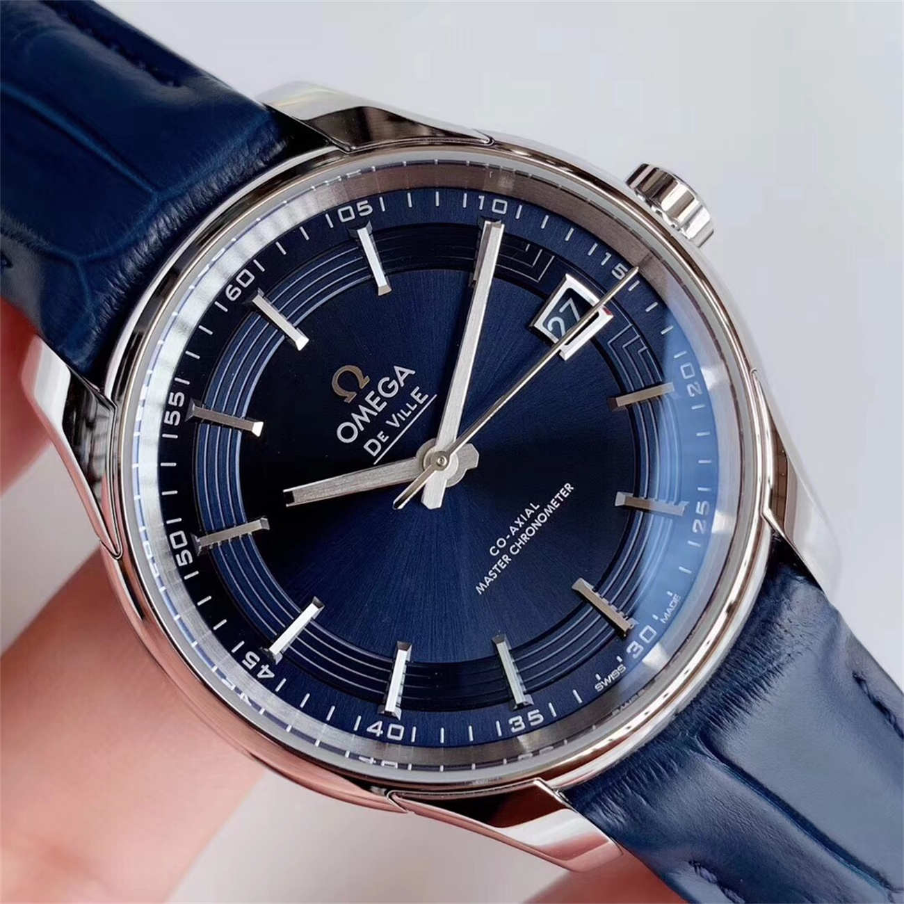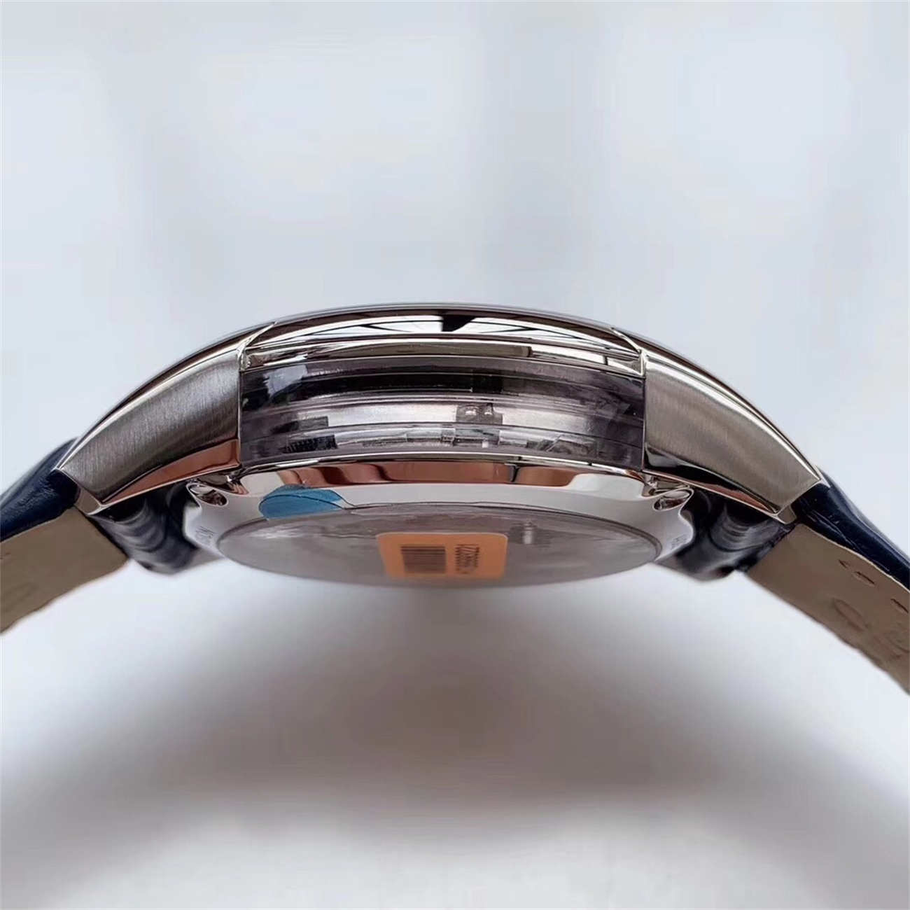A: Yes! Just like the genuine watch, this Omega De Ville Hour Vision Blue replica features transparent sapphire windows on the sides of the case casebody.
