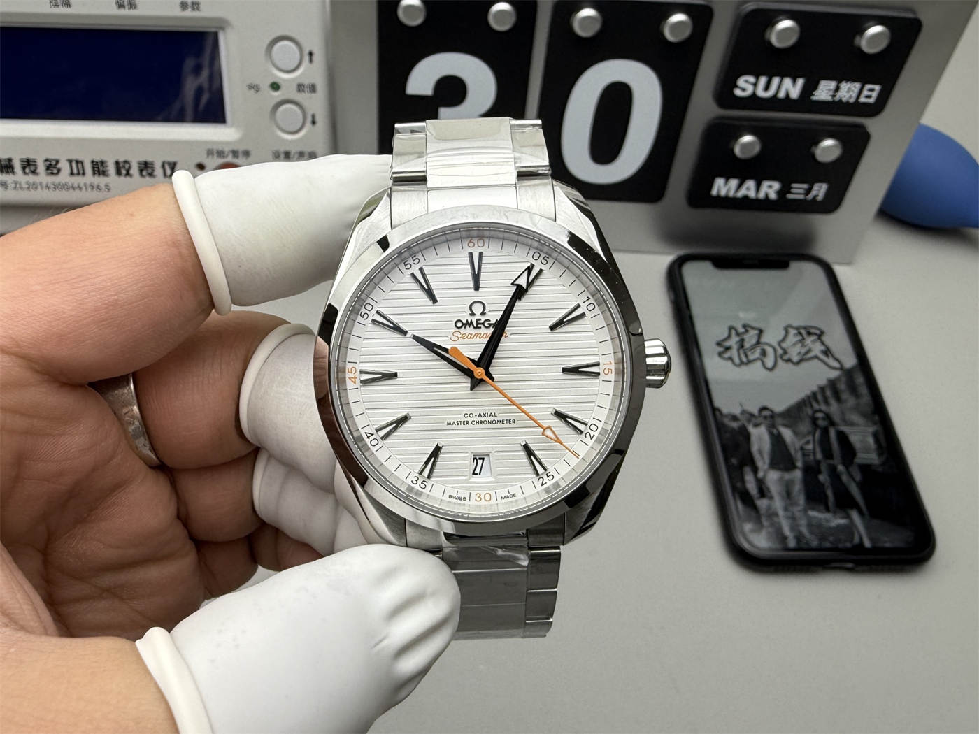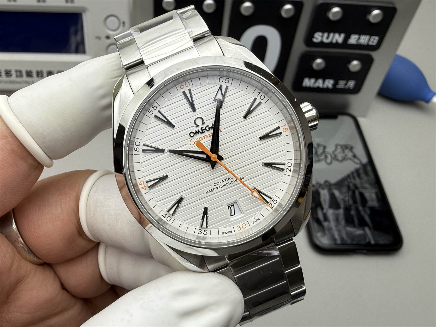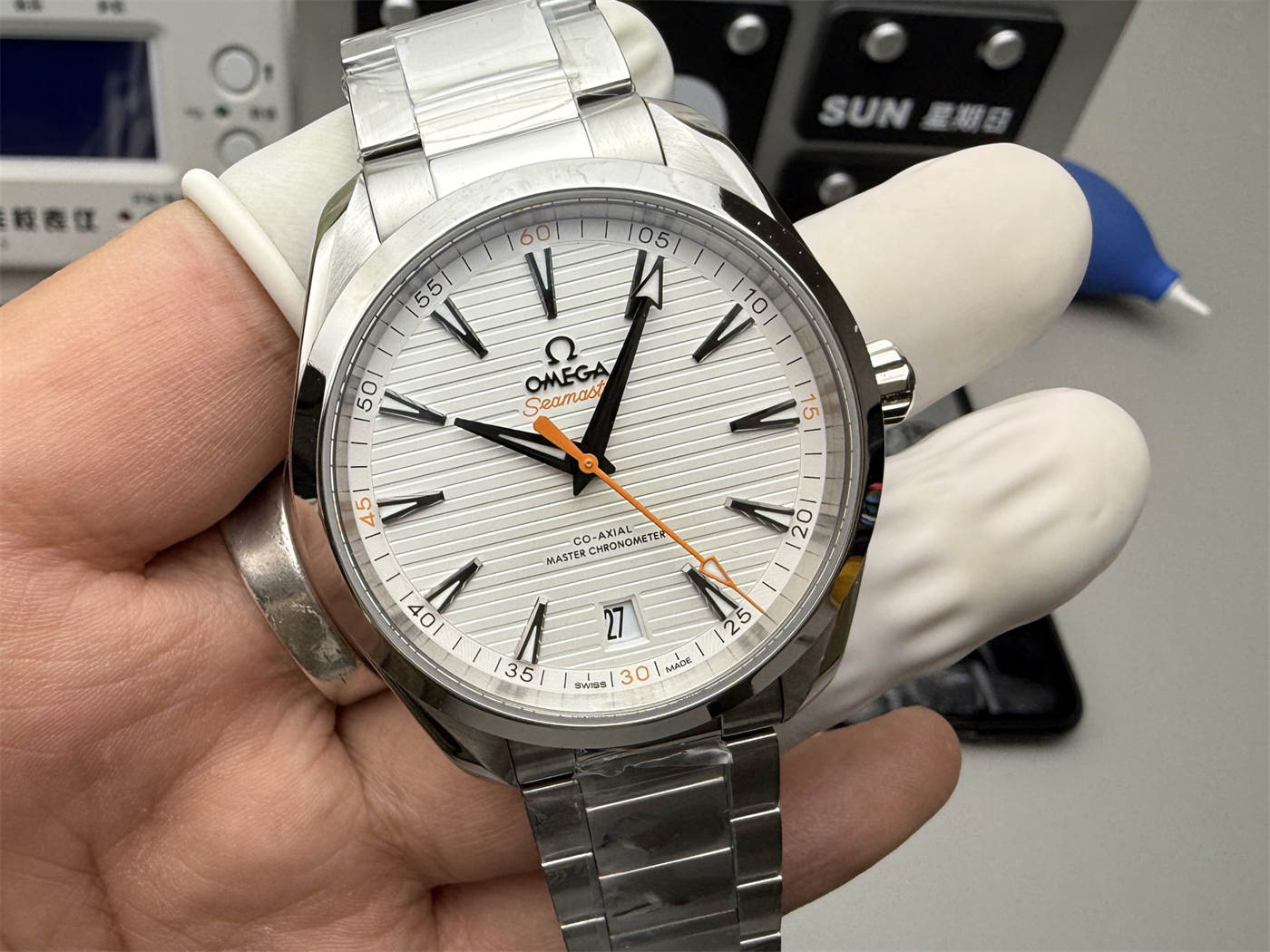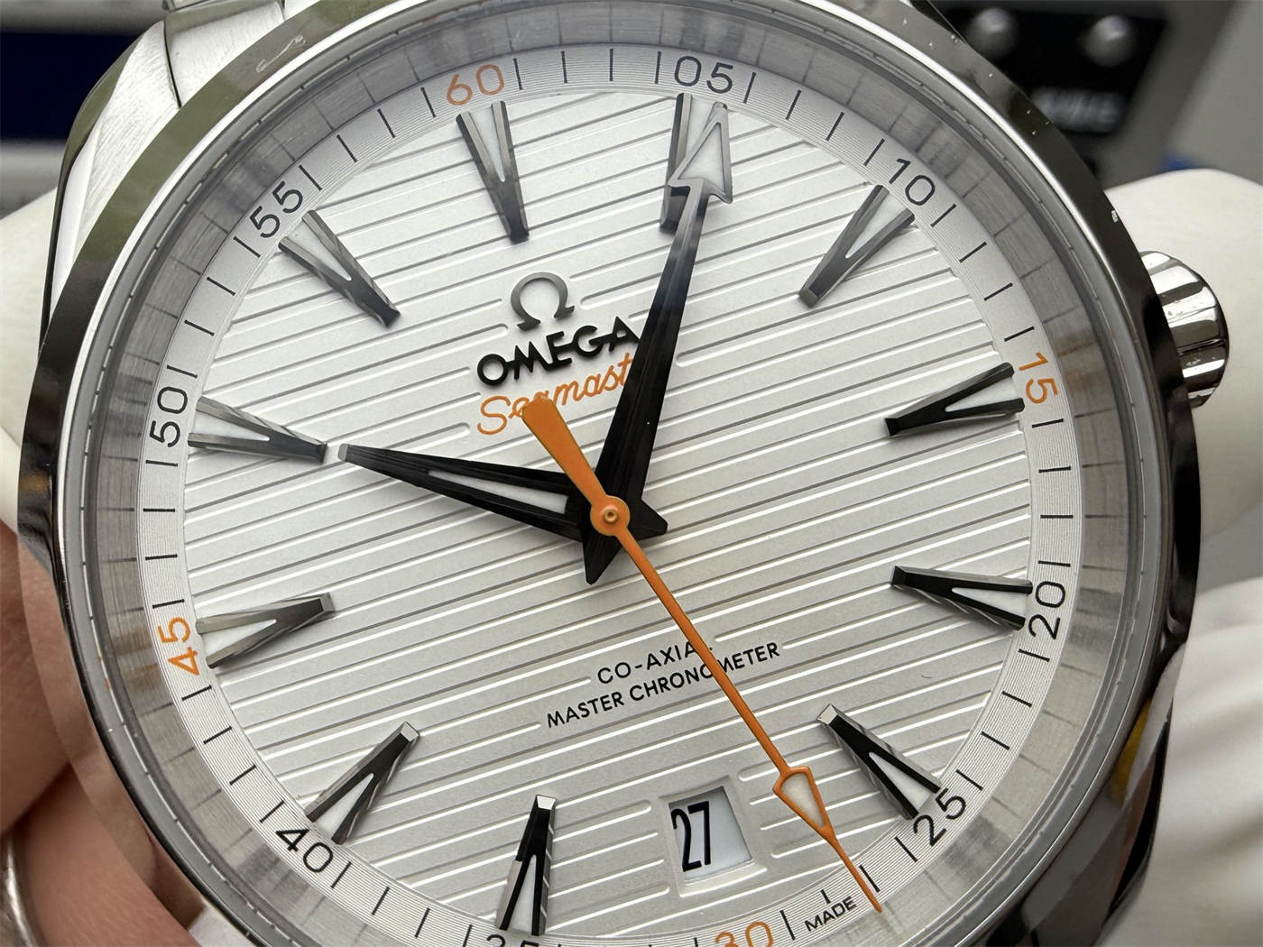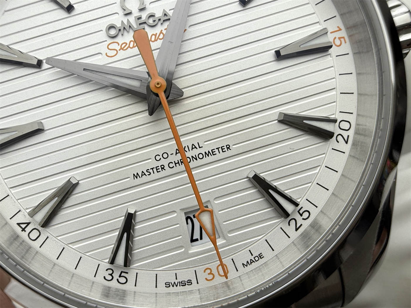 Q2: What color is the dial?This replica features a silver “teak” patterned dial, inspired by the original Aqua Terra design.