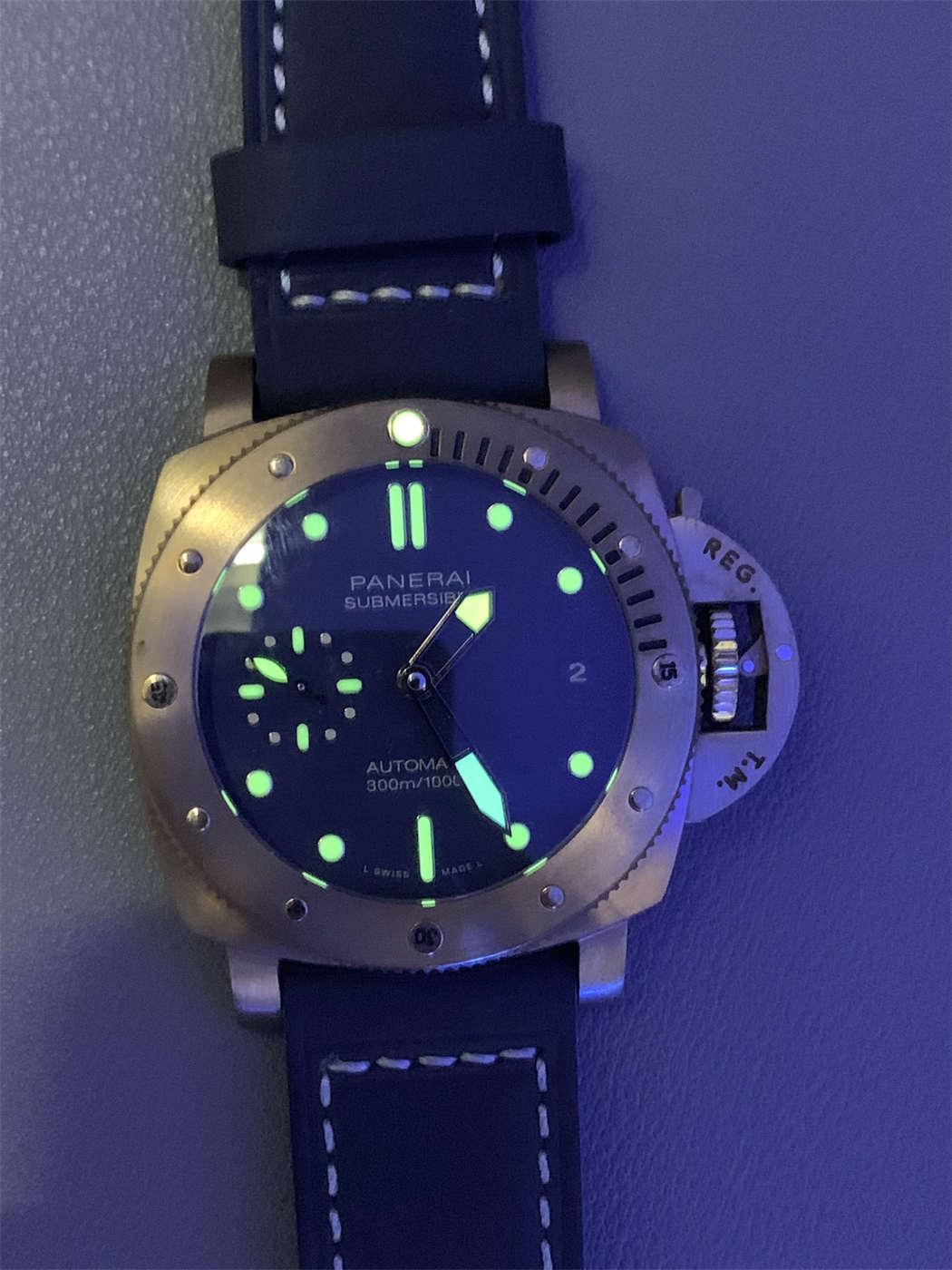 Deep navy blue dial matching the genuine “Blu Abisso” tone