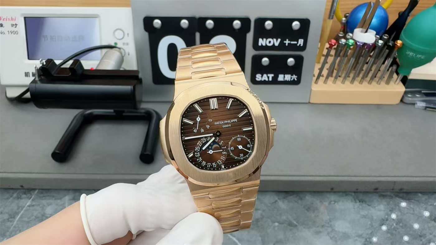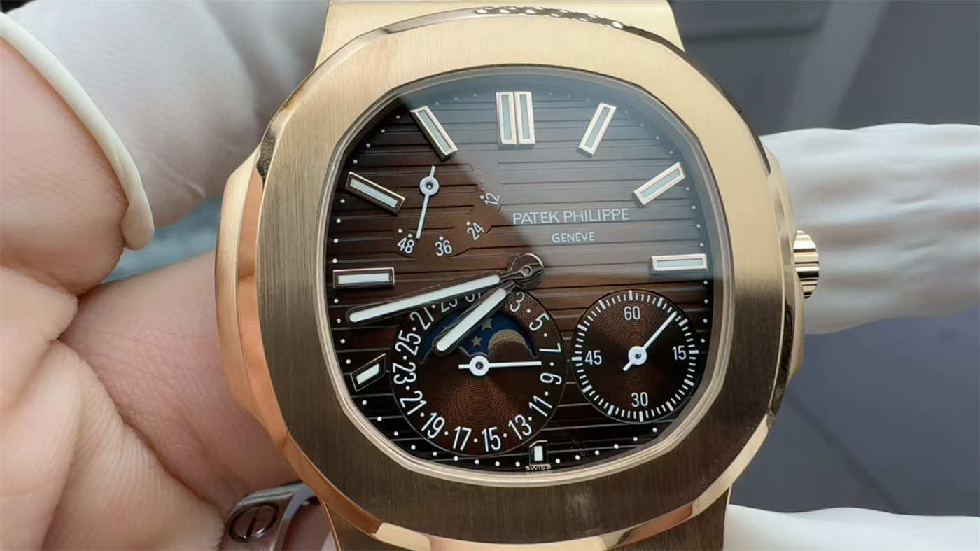 This nautilus 5712/1r replica features the correct brown-grey gradient dial, a key identifier of the rose gold reference.