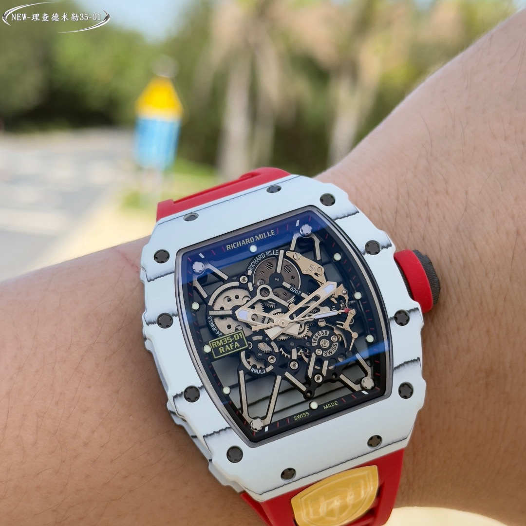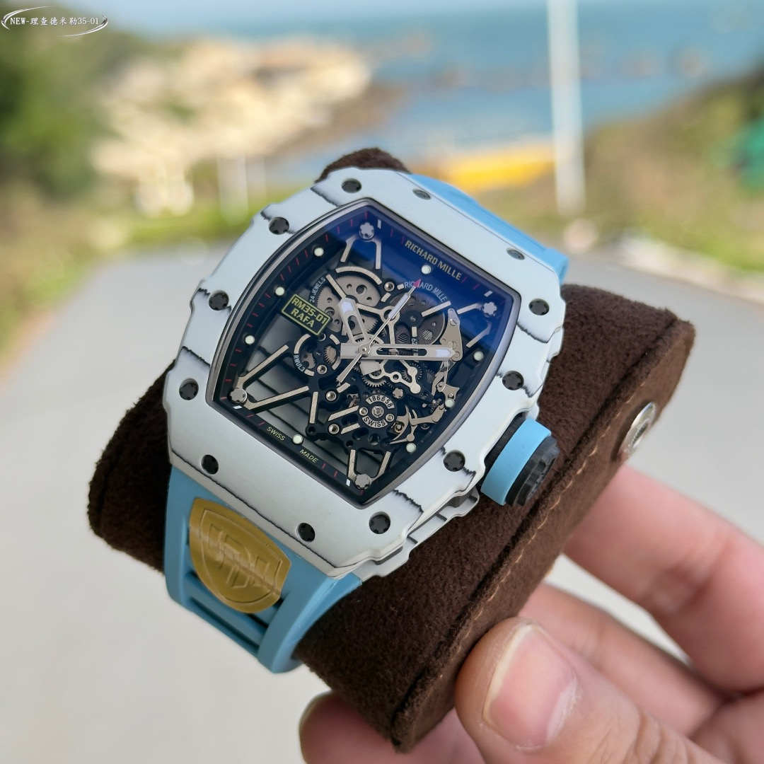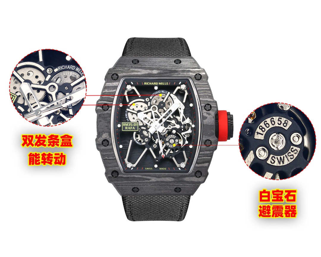 A: No. The RM 35-01 is a Manual Winding watch, not a tourbillon (that’s the RM 27-01). This replica correctly mimics the skeletonized manual movement of the original.