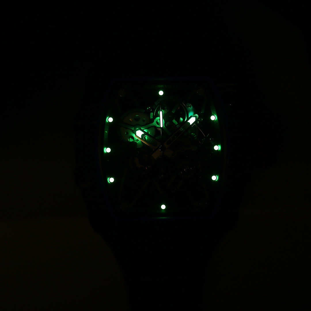 Skeleton Design: The manual-winding movement is fully skeletonized. You can see the gear train and the white jewel shock absorbers, replicating the architecture of the Gen RMUL3.