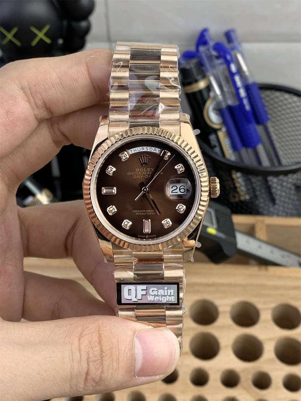 Unlike cheap replicas that feel hollow on the wrist, this Day-Date 36 gold replica uses a weighted construction to replicate the density of genuine gold models.