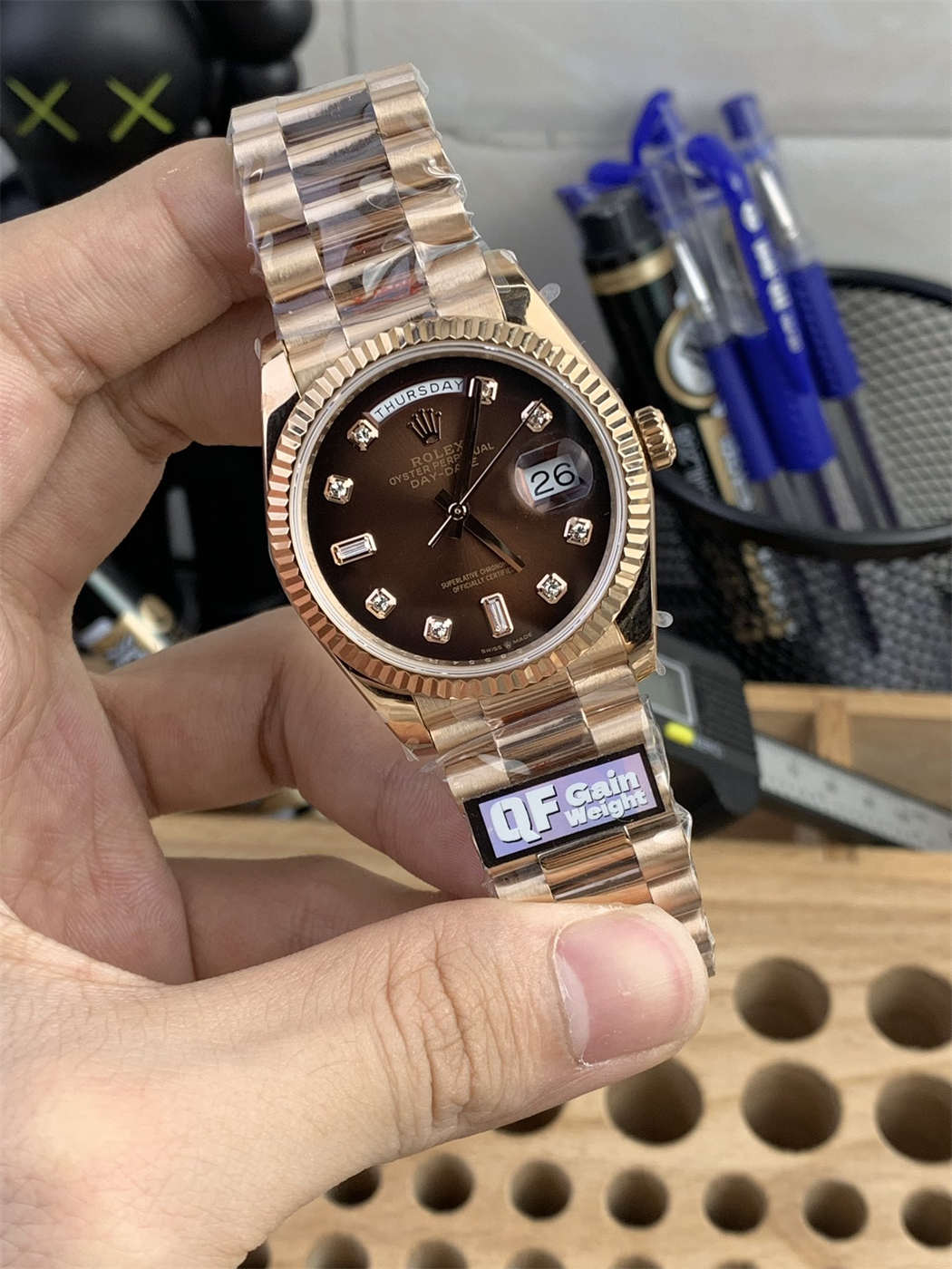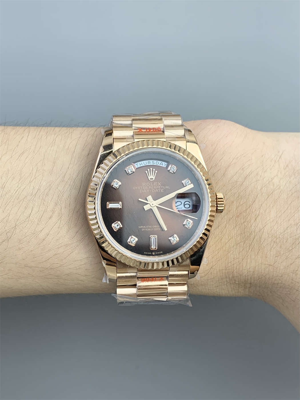 Q: Is this Rolex Day-Date 36 gold replica heavy like the real one?A: Yes. This version uses a weighted case and bracelet, giving it a much more authentic gold feel compared to lightweight replicas.