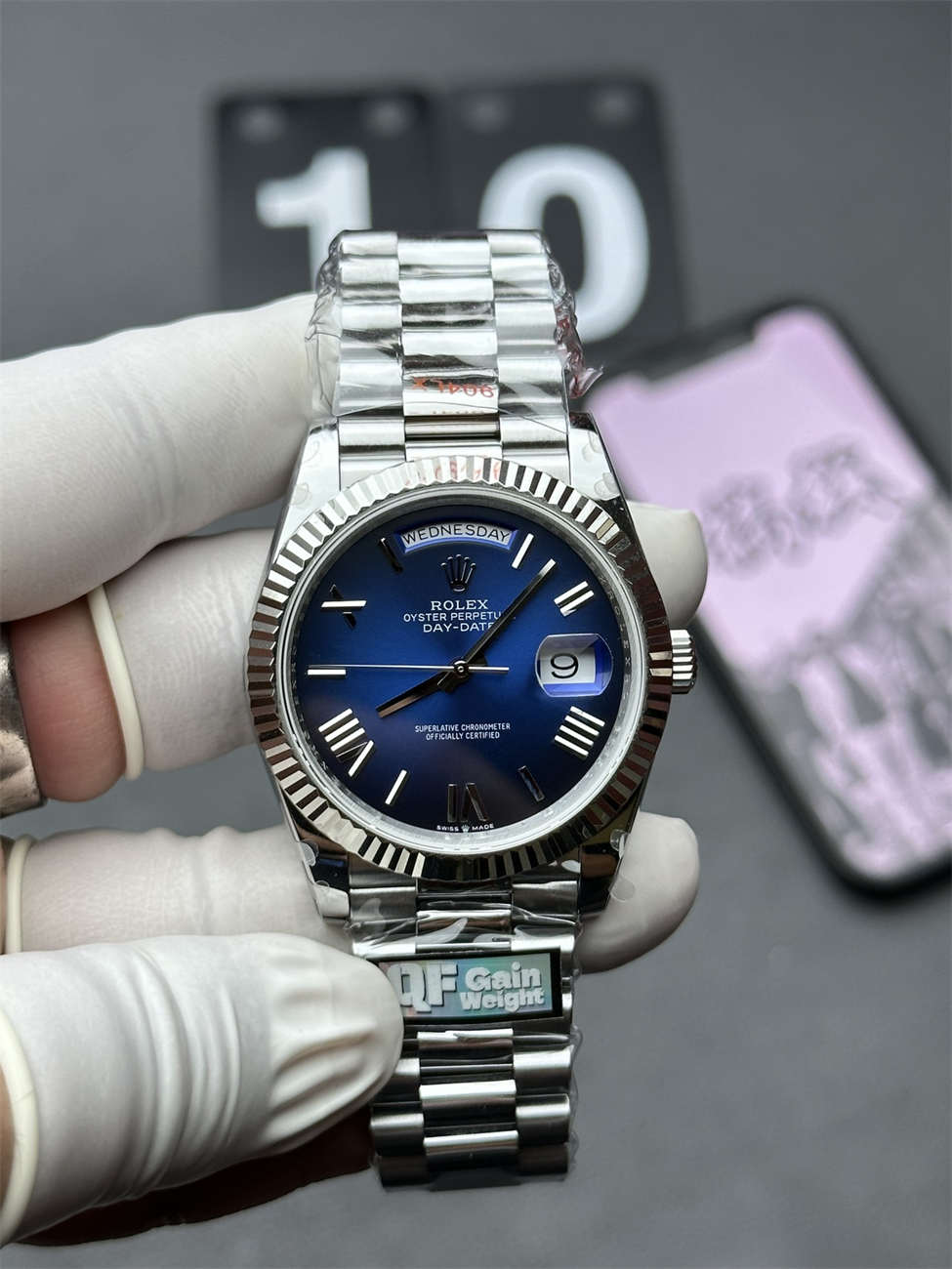 Not everyone wants a flashy yellow gold watch. For those who prefer understated luxury, the Rolex Day-Date 36 White Gold Replica (Ref. 128239) is the perfect choice. At first glance, it looks like steel, but the weight tells a different story. QF Factory has replicated this “Heavy Metal” feel using a high-density Tungsten Alloy core, making it one of the most realistic replicas on the market.