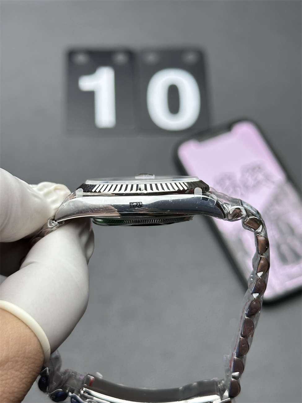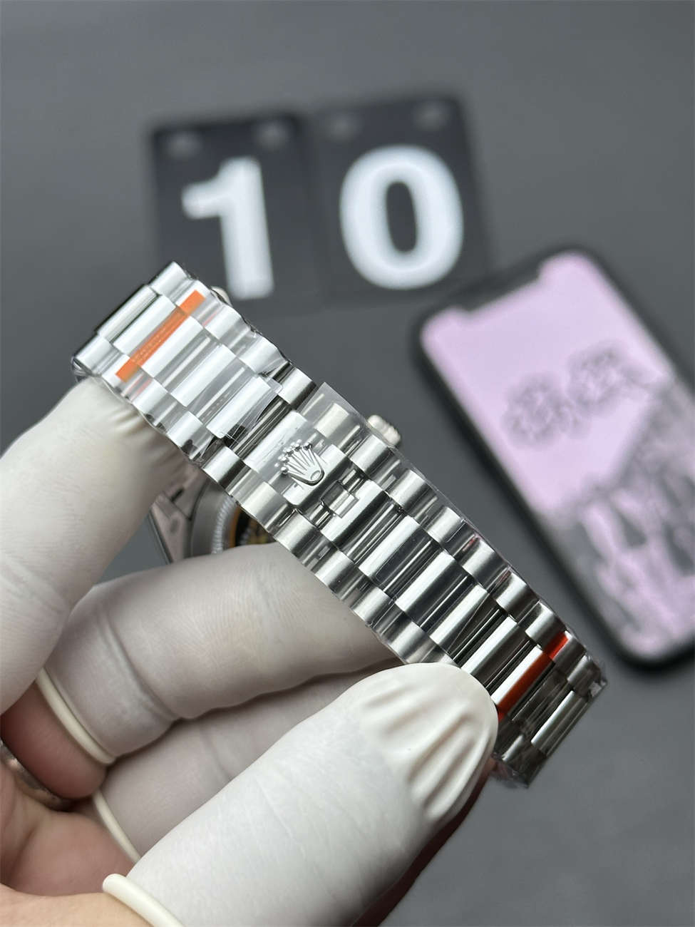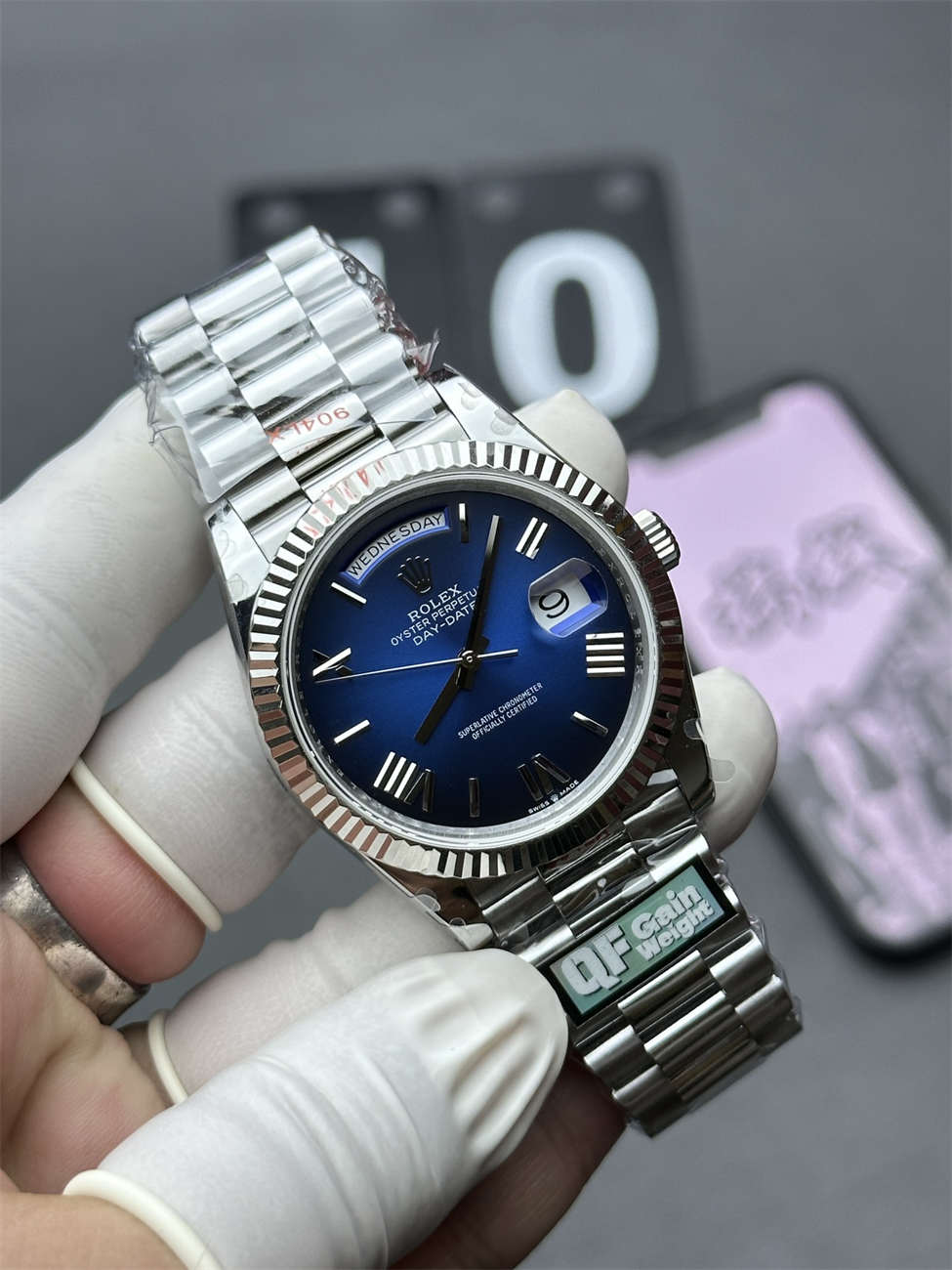 A: To the untrained eye, it looks like steel. However, White Gold has a warmer, “creamy” luster compared to the cold blueish tint of steel. QF plates this Rolex Day-Date 36 White Gold Replica with Platinum/Rhodium to mimic that precious metal shine perfectly.