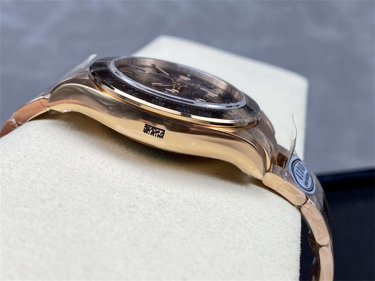 The case of this Rolex Daytona Everose Gold measures the correct 40mm diameter with an authentic 12.2mm thickness, perfectly matching the genuine Daytona profile.
