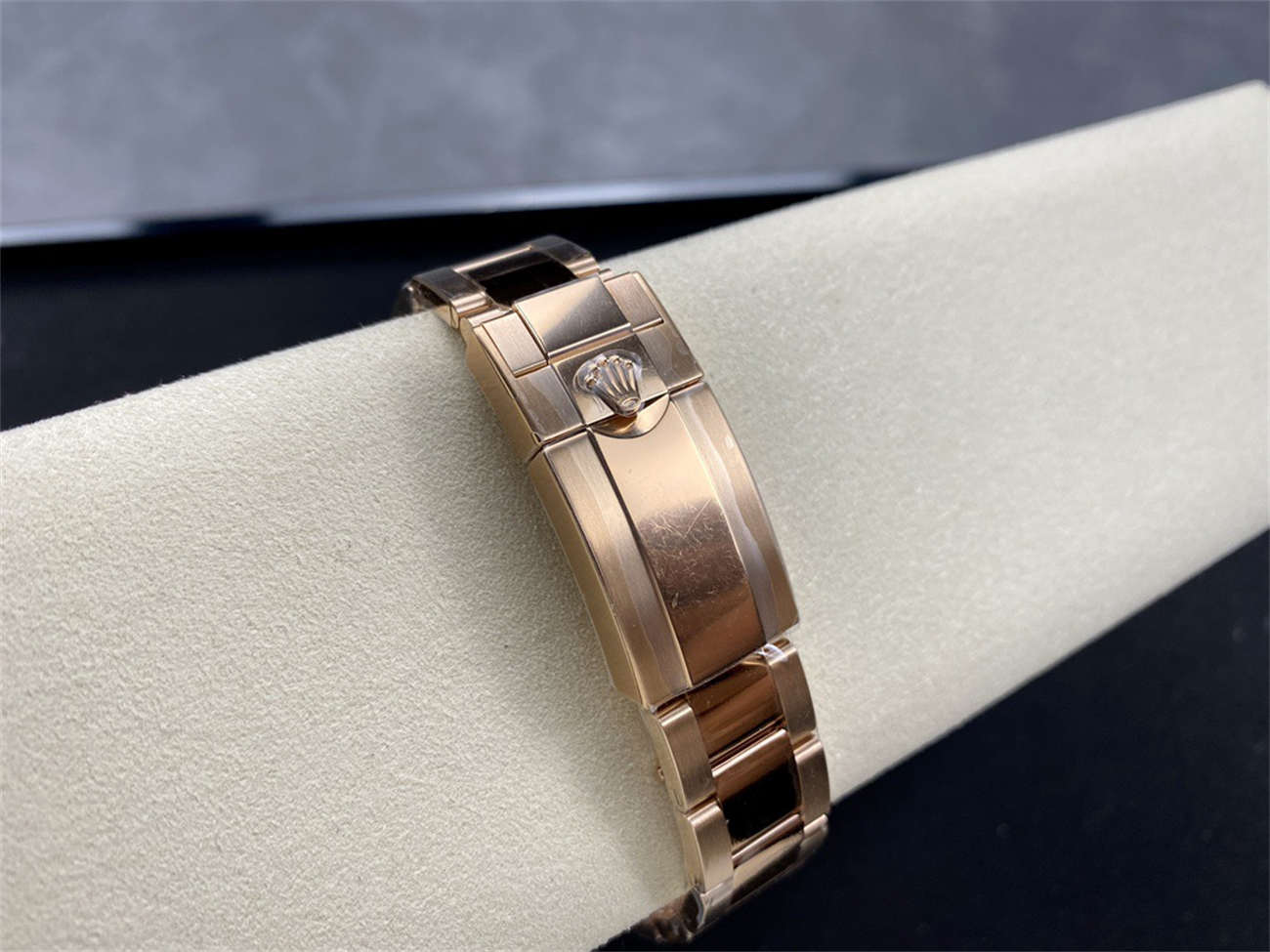 A: The watch uses high-quality Everose-style PVD coating over 904L steel, offering a realistic appearance and better durability for daily wear.