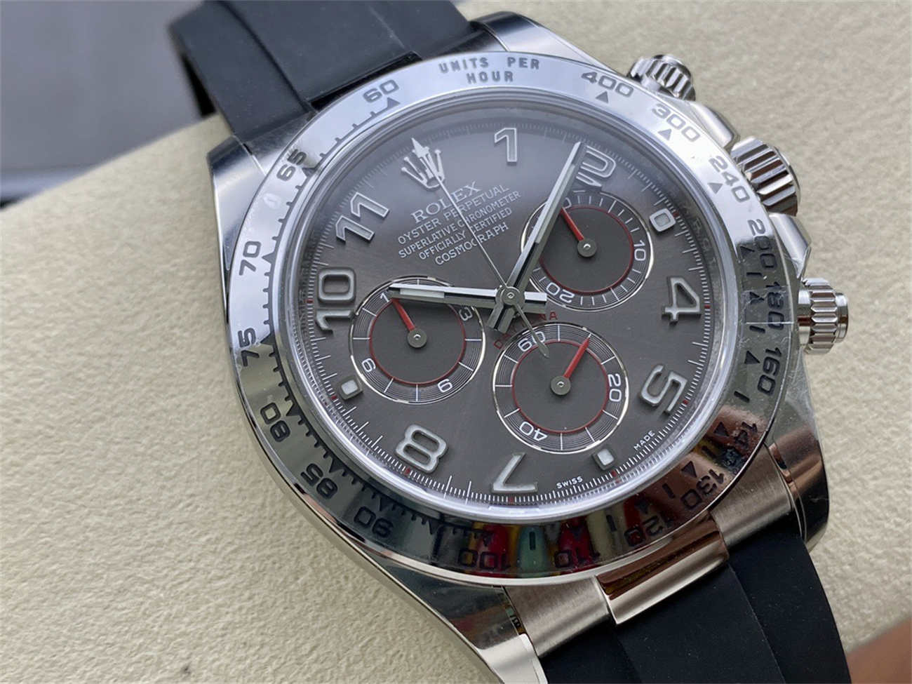 The standout feature of this Rolex Daytona Grey Dial is its beautifully balanced slate-grey tone. Under different lighting conditions, the dial shifts subtly between silver-grey and darker slate hues, closely mirroring the genuine watch.