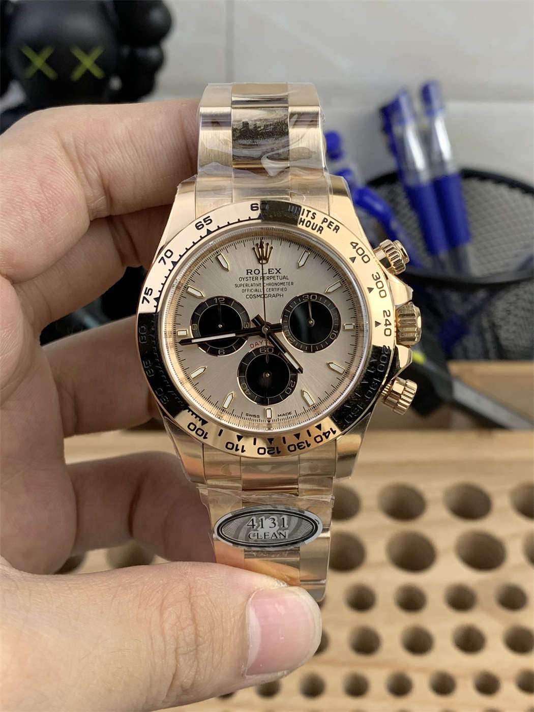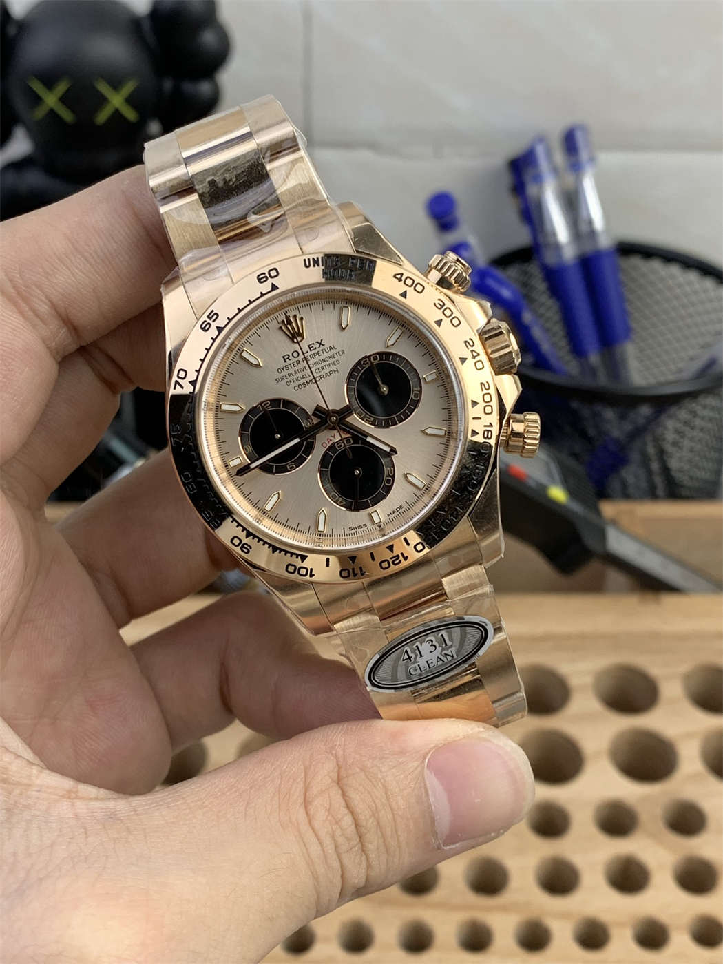 This Rolex Daytona rose gold replica from Clean Factory features a full 18K Everose gold case, flawless dial detailing, and the latest clone Rolex 4131 movement. As one of the most accurate modern Daytona replicas, it delivers exceptional weight, finish, and chronograph performance.