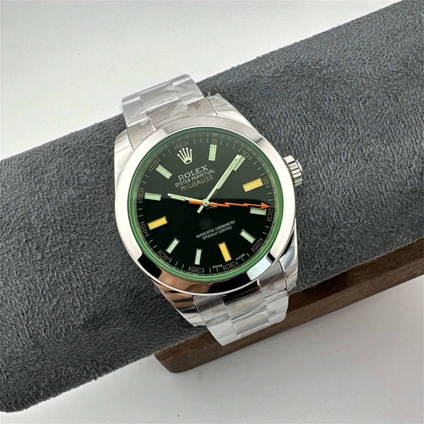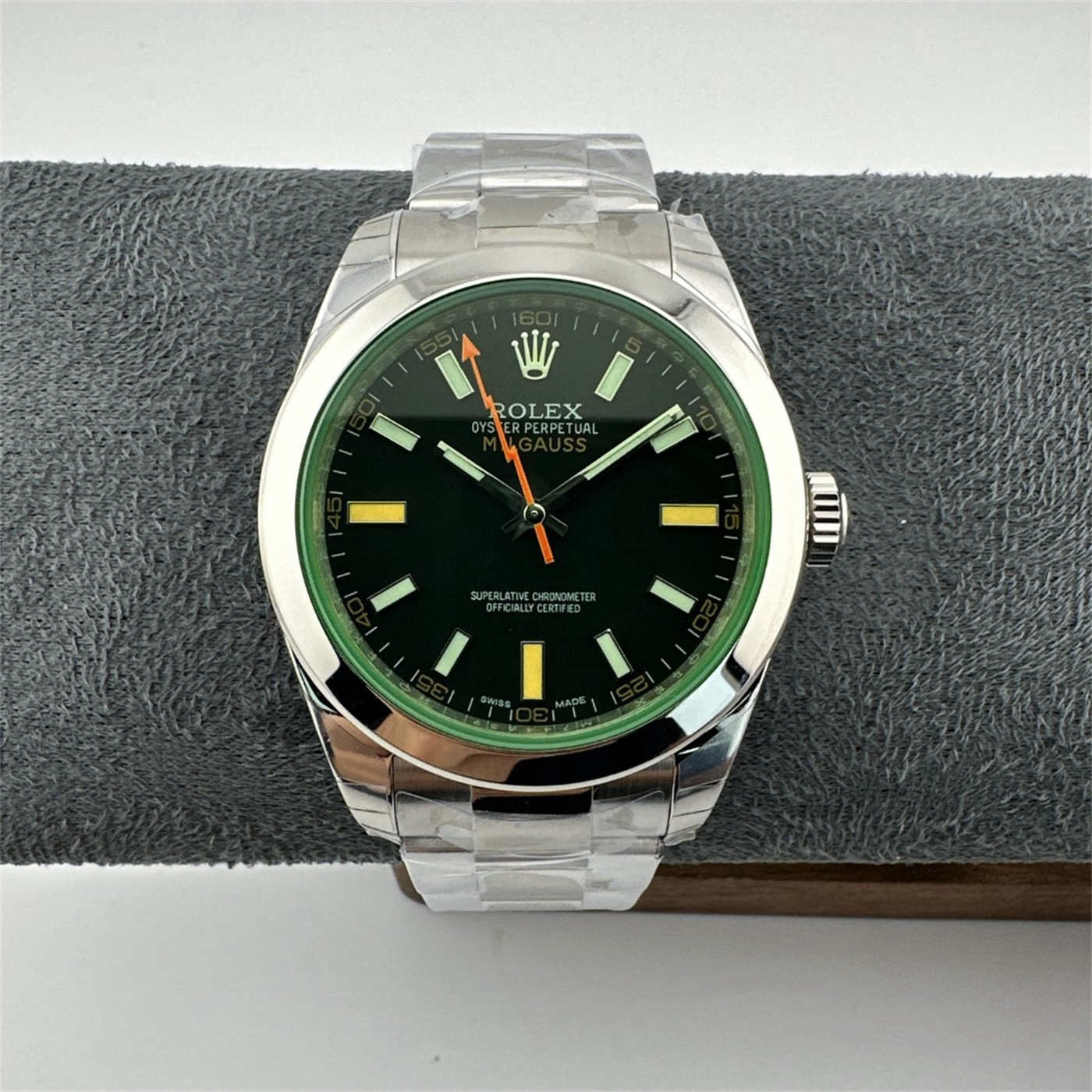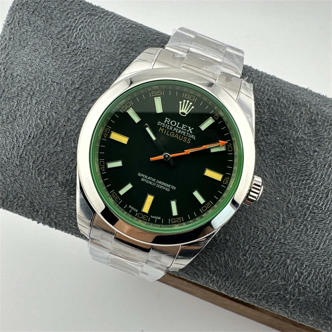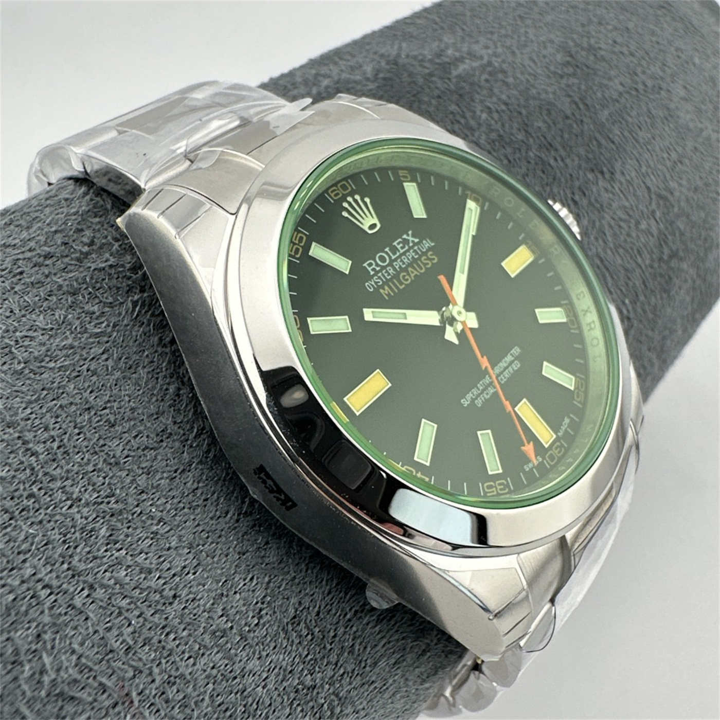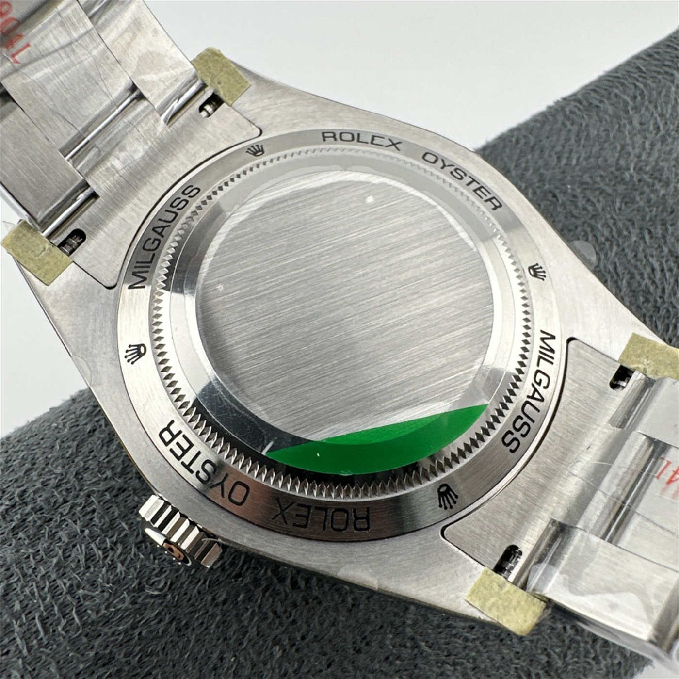 Internal Detail: Just like the Gen, this replica includes a soft-iron inner case (Faraday cage) inside the 904L steel back. This protects the movement from magnetic interference, staying true to the Milgauss heritage.