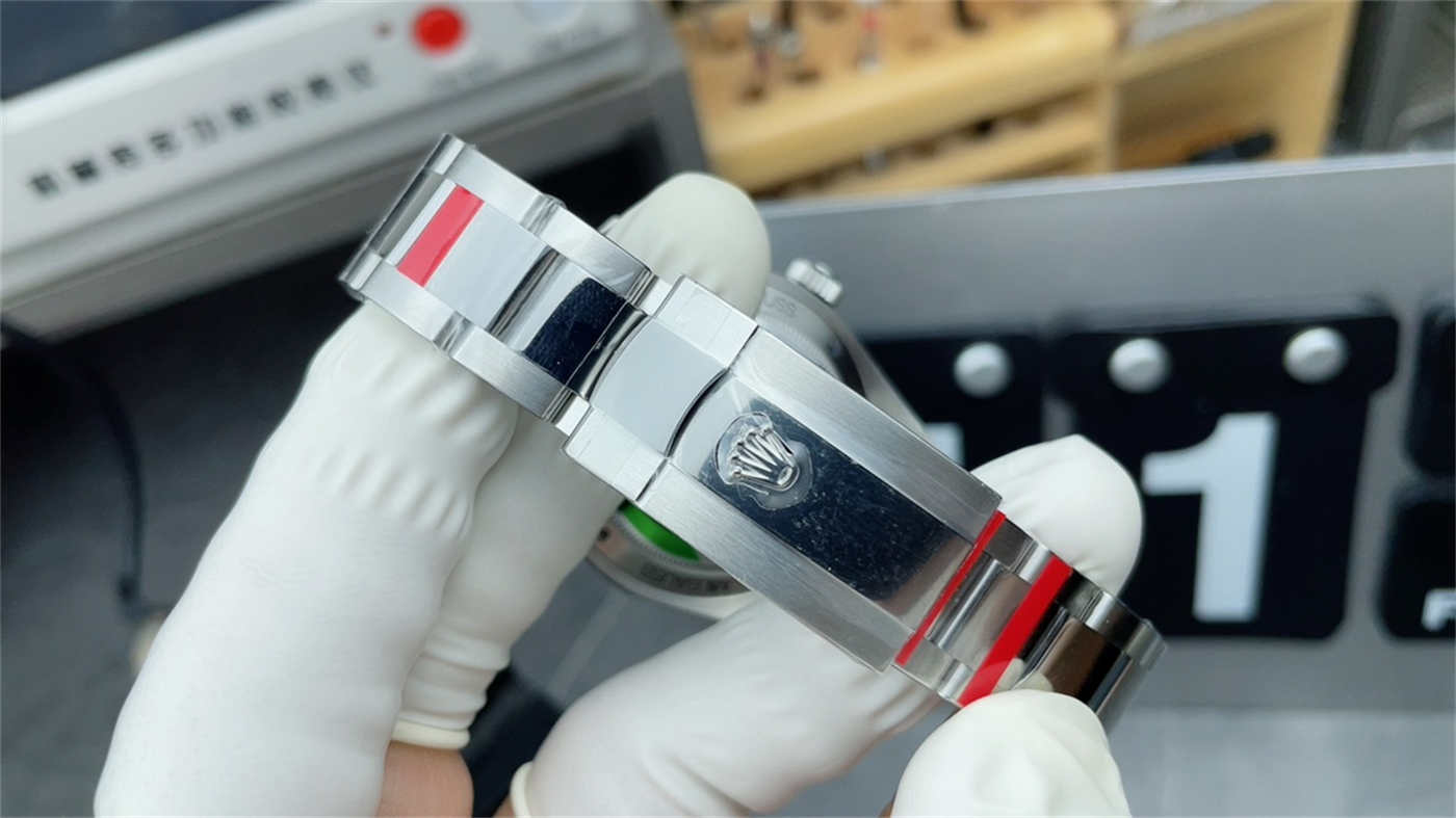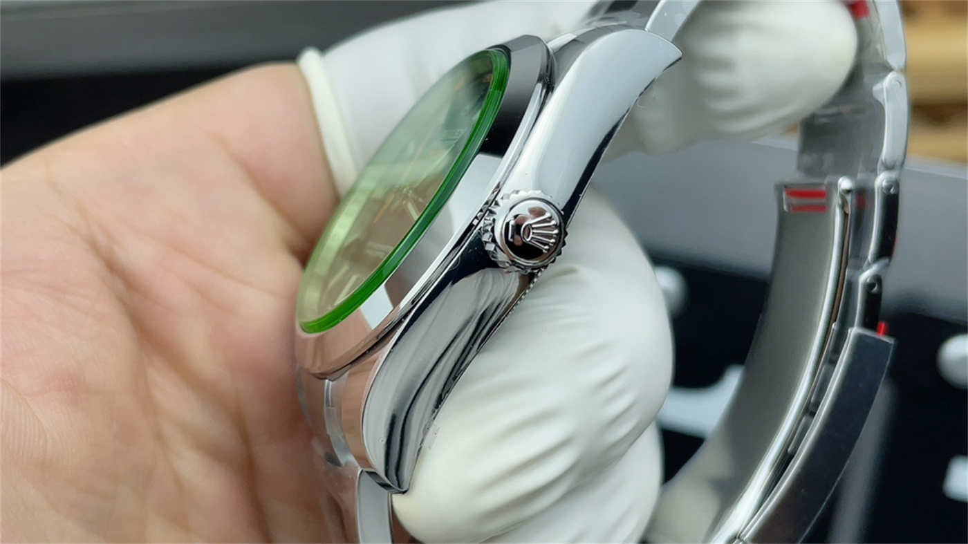 A: No. And this is correct! The Genuine Rolex Milgauss with Green Glass does NOT have the laser-etched crown (LEC) in the crystal because it would interfere with the green tint. VSF correctly omitted the LEC, showing great attention to detail.