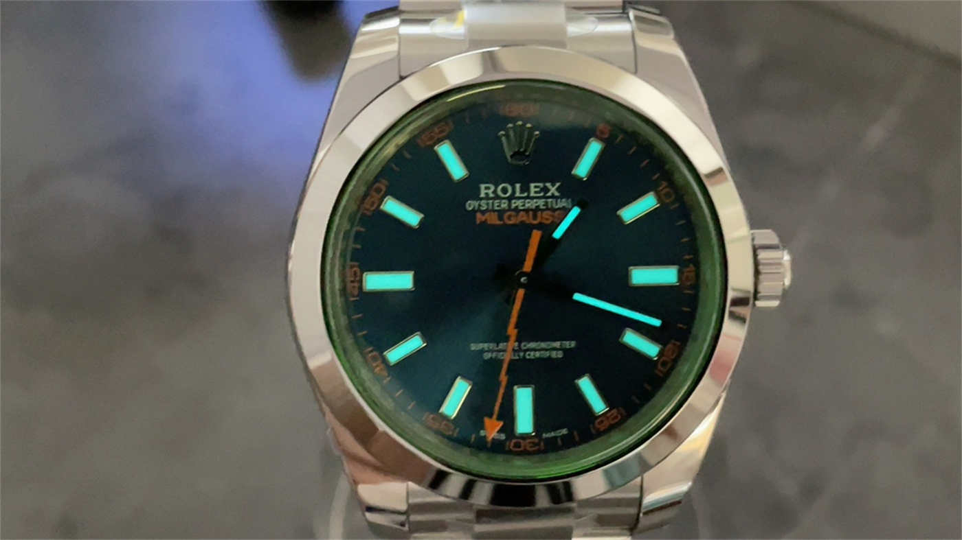 The Rolex Milgauss Z-Blue is a cult classic. The combination of the orange lightning hand, the green crystal, and the electric blue dial sounds crazy, but it works perfectly.
