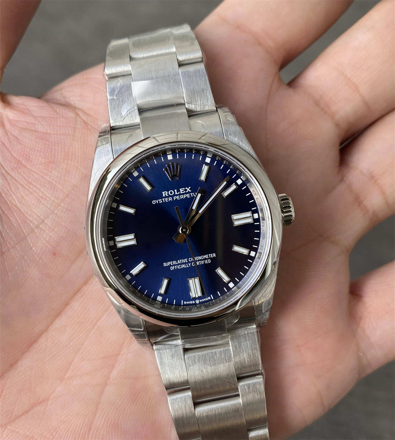 These elements ensure the Rolex Oyster Perpetual 36 blue dial replica looks refined and authentic on the wrist.