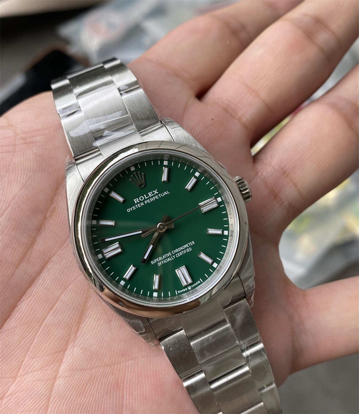 The Rolex Oyster Perpetual 36 green dial replica represents the ideal balance between vintage Rolex sizing and modern watchmaking standards. The 36mm case is widely considered the most versatile size, fitting comfortably on both slim and average wrists.
