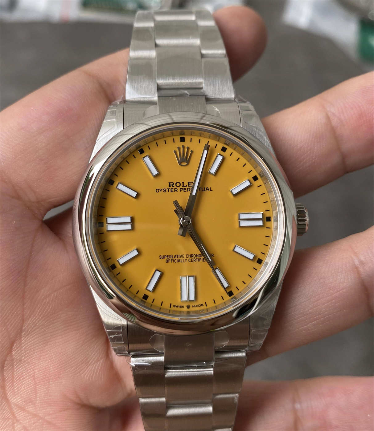 The bright yellow dial is energetic yet refined, offering strong visual impact while maintaining Rolex’s signature minimalism. Combined with the 41mm case, the watch delivers a modern wrist presence that appeals to contemporary collectors.