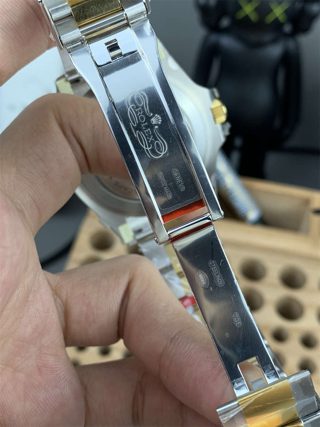 Material: 904L Oystersteel with gold-tone center links and bezel markings