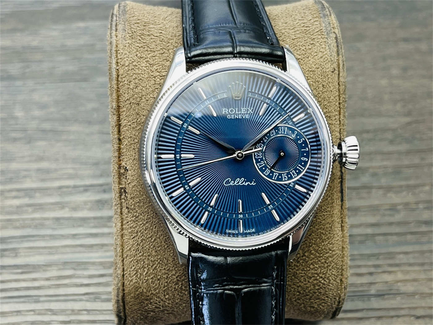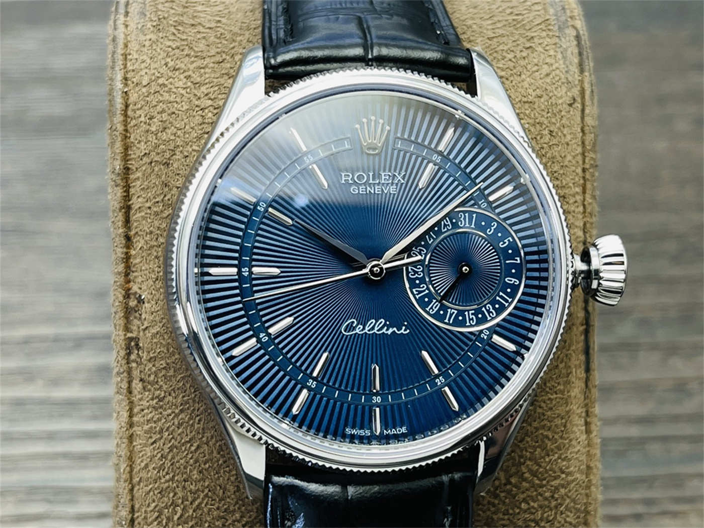 Is this an original Rolex watch?No. This is a VR Factory Rolex Cellini Blue Dial replica, designed to replicate the appearance of the original M50519-0015.