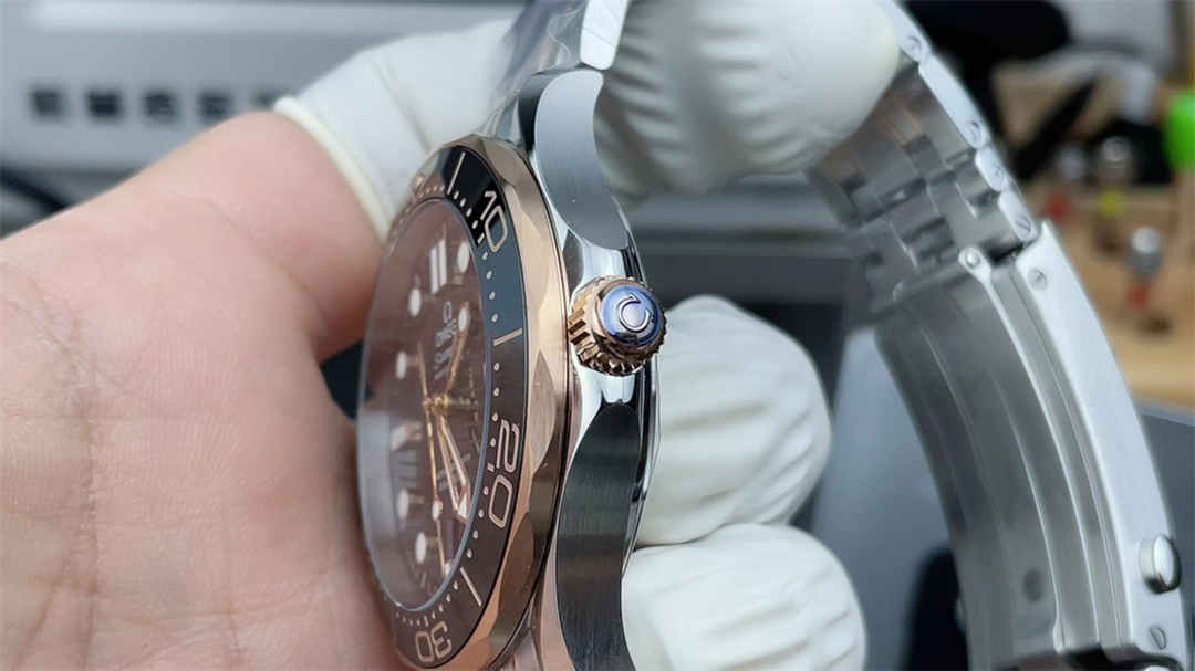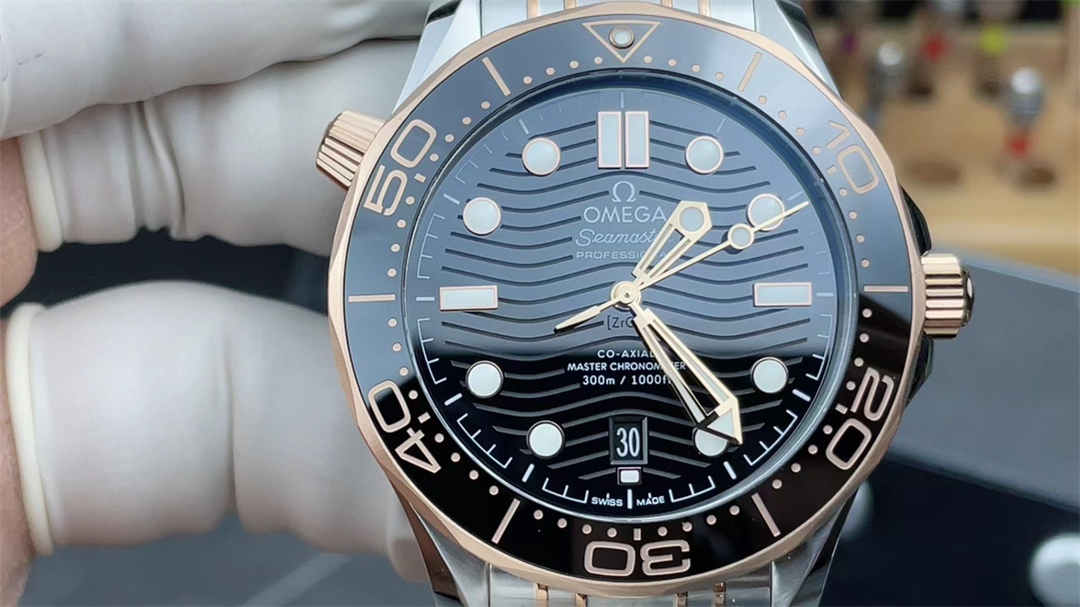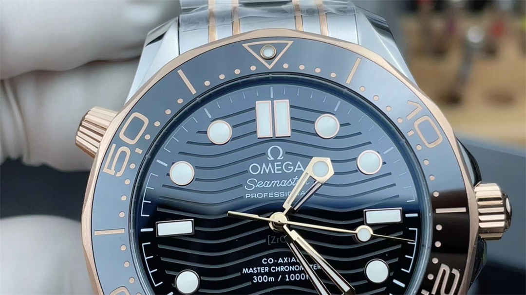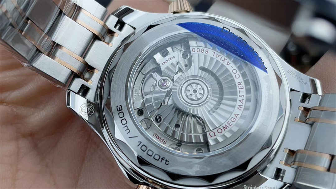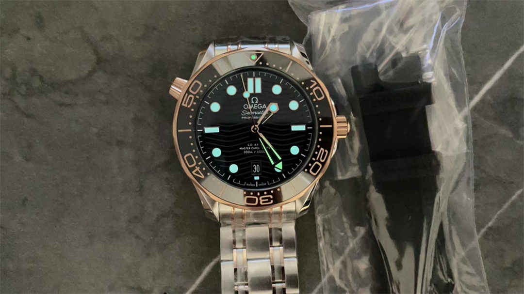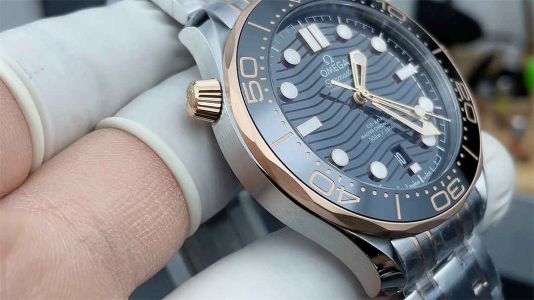 It has a 42mm stainless steel case with rose gold accents, identical to the authentic Omega Seamaster Diver 300M.