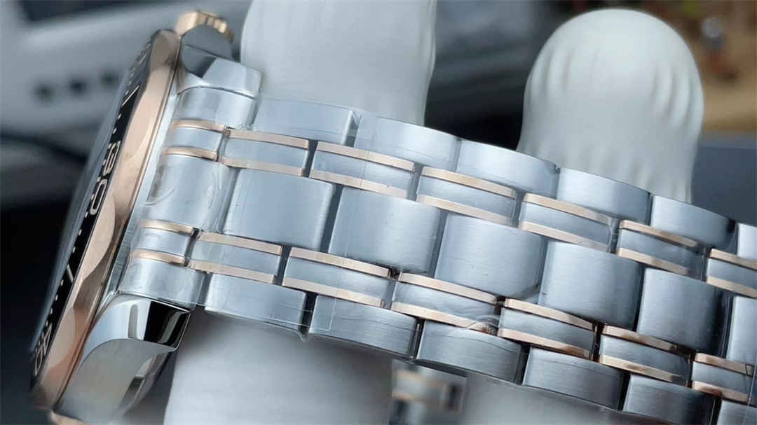The two-tone stainless steel and rose gold bracelet is polished and brushed with solid links and a push-button clasp, closely replicating the feel of the original Omega bracelet.