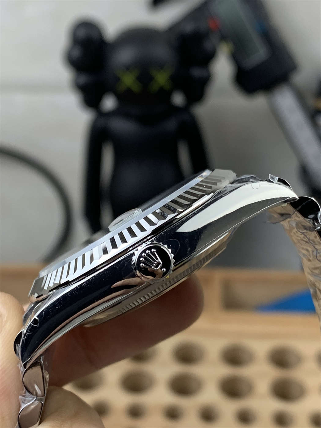 Under different lighting conditions, the dial shifts subtly, just like the genuine platinum Day-Date.