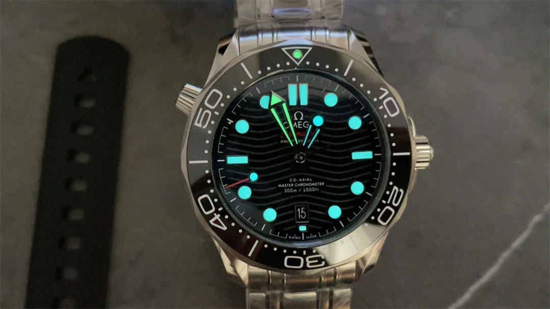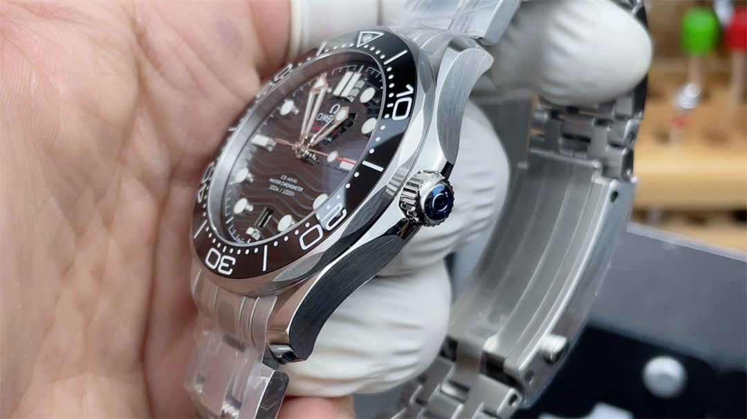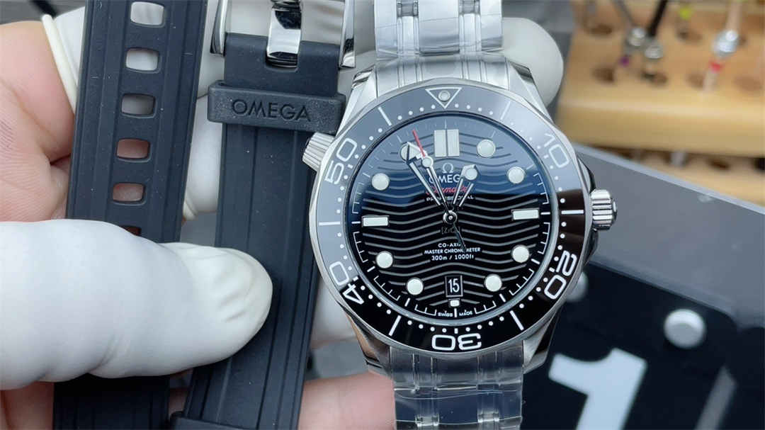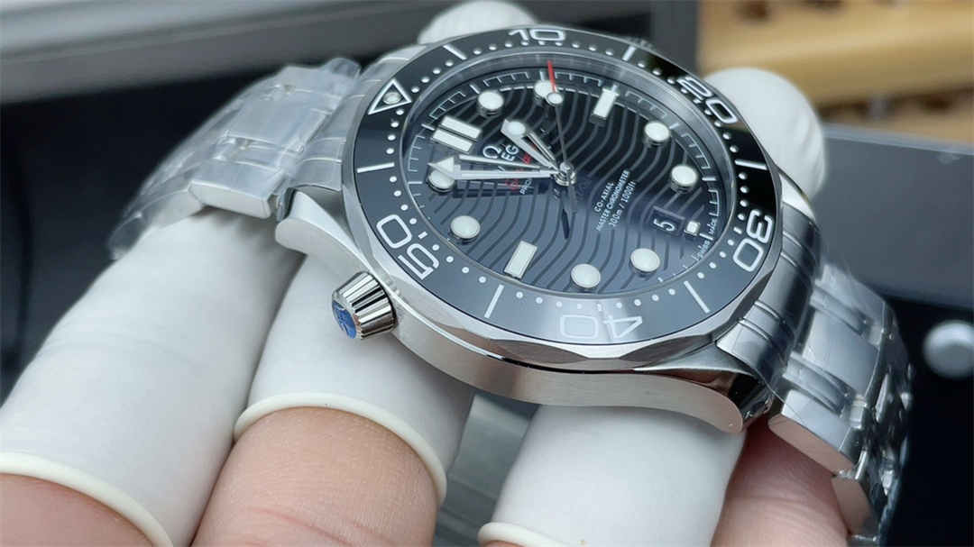 It features a 42mm stainless steel case with ceramic bezel, identical to the authentic Omega Diver 300M.