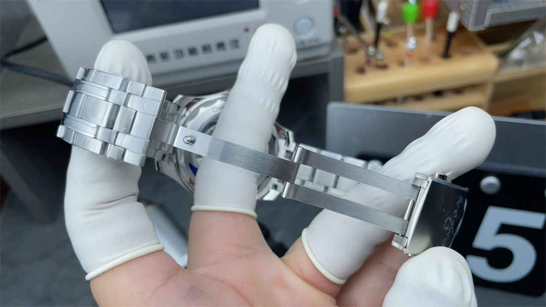 The stainless steel bracelet is polished and brushed with solid links and a secure push-button clasp, closely replicating the feel of the original Omega bracelet.