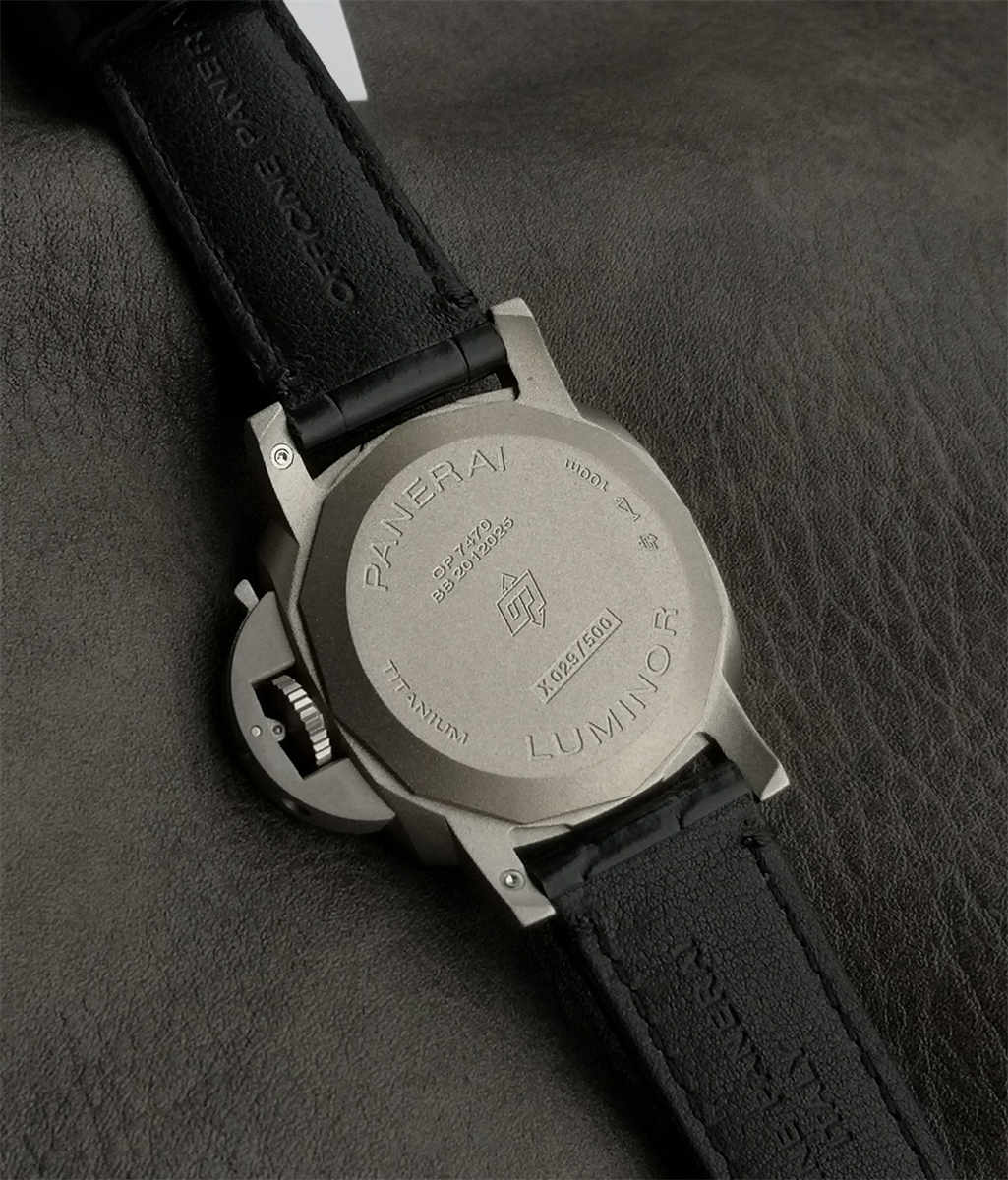 One of the biggest highlights of the VSF Panerai PAM01279 is its Grade-5 titanium case, crafted with a uniform sandblasted texture. Titanium is significantly lighter than stainless steel while providing excellent strength, durability, and corrosion resistance. The matte surface gives this model a modern, tactical look that is both understated and luxurious.